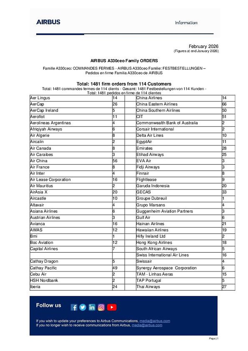 Airbus A330neo customer list February 2026