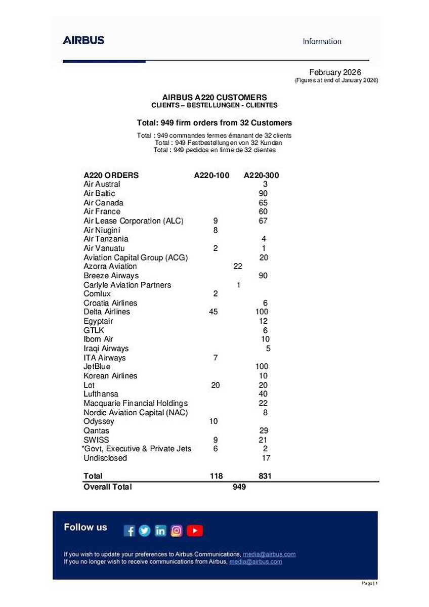 Airbus A220 customer list February 2026