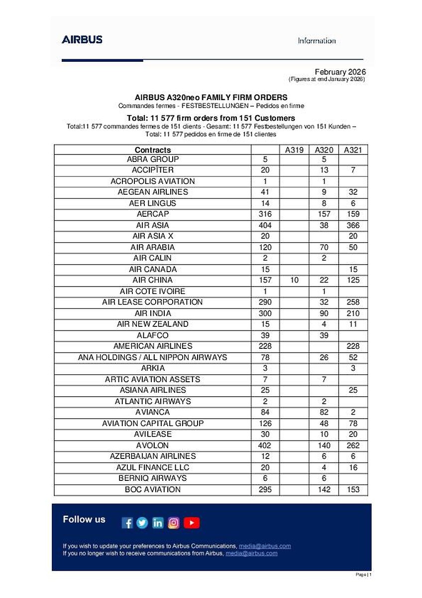 Airbus A320neo customer list February 2026