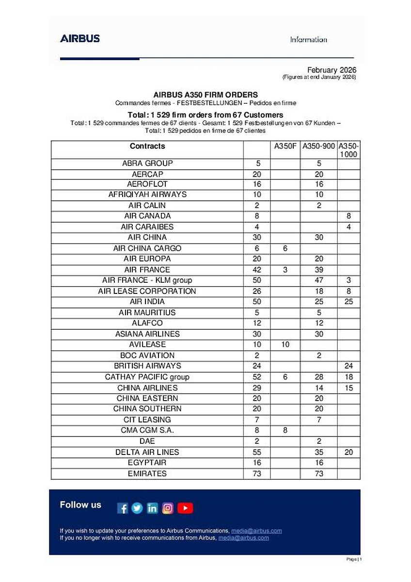 Airbus A350 customer list February 2026