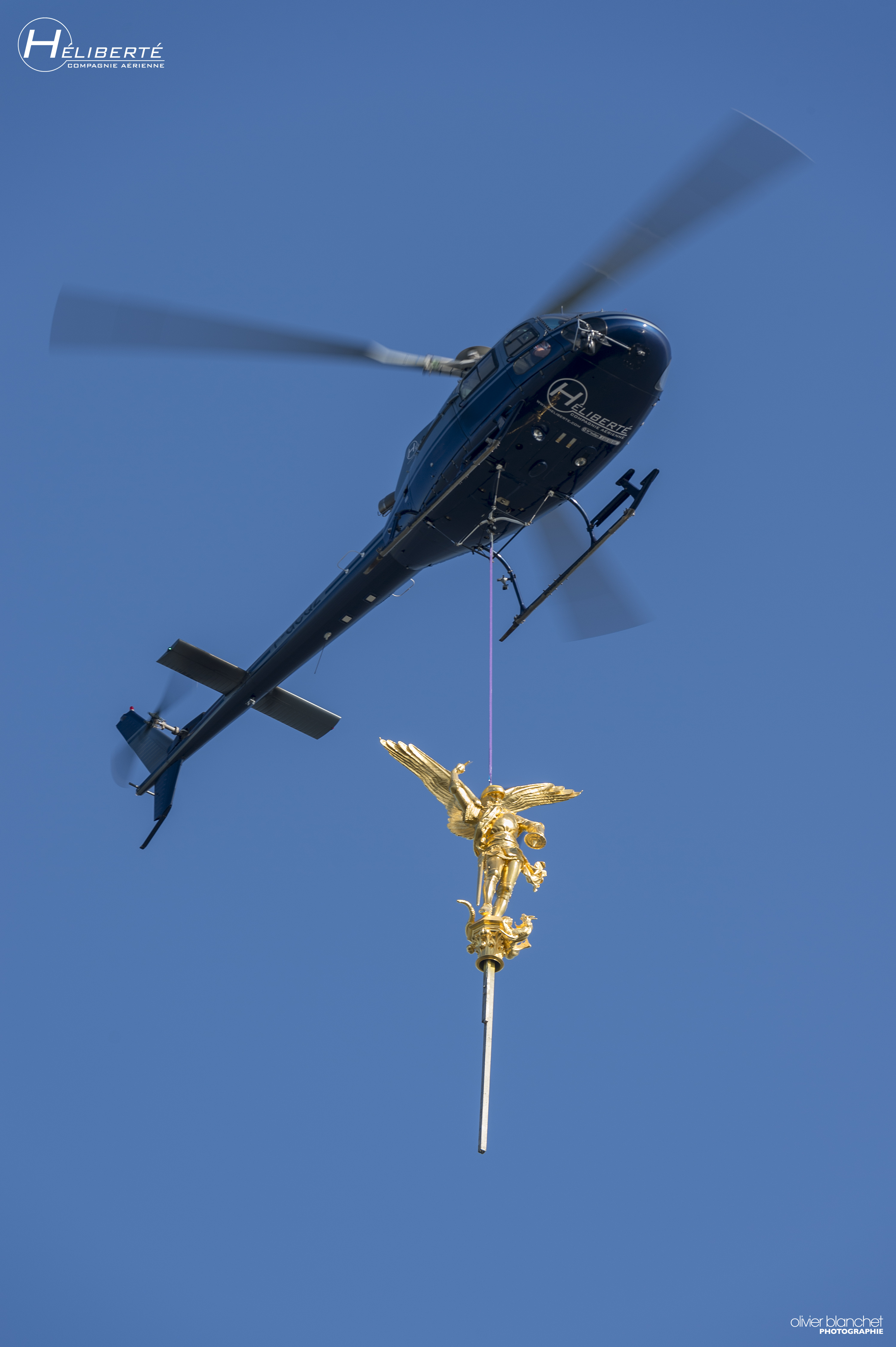 Clad in over five ounces of gold, the archangel flew over the area, suspended from an Écureuil AS350 BA helicopter piloted by Frédéric L’Horset, who steered it to the abbey’s pinnacle 525 feet above sea level.