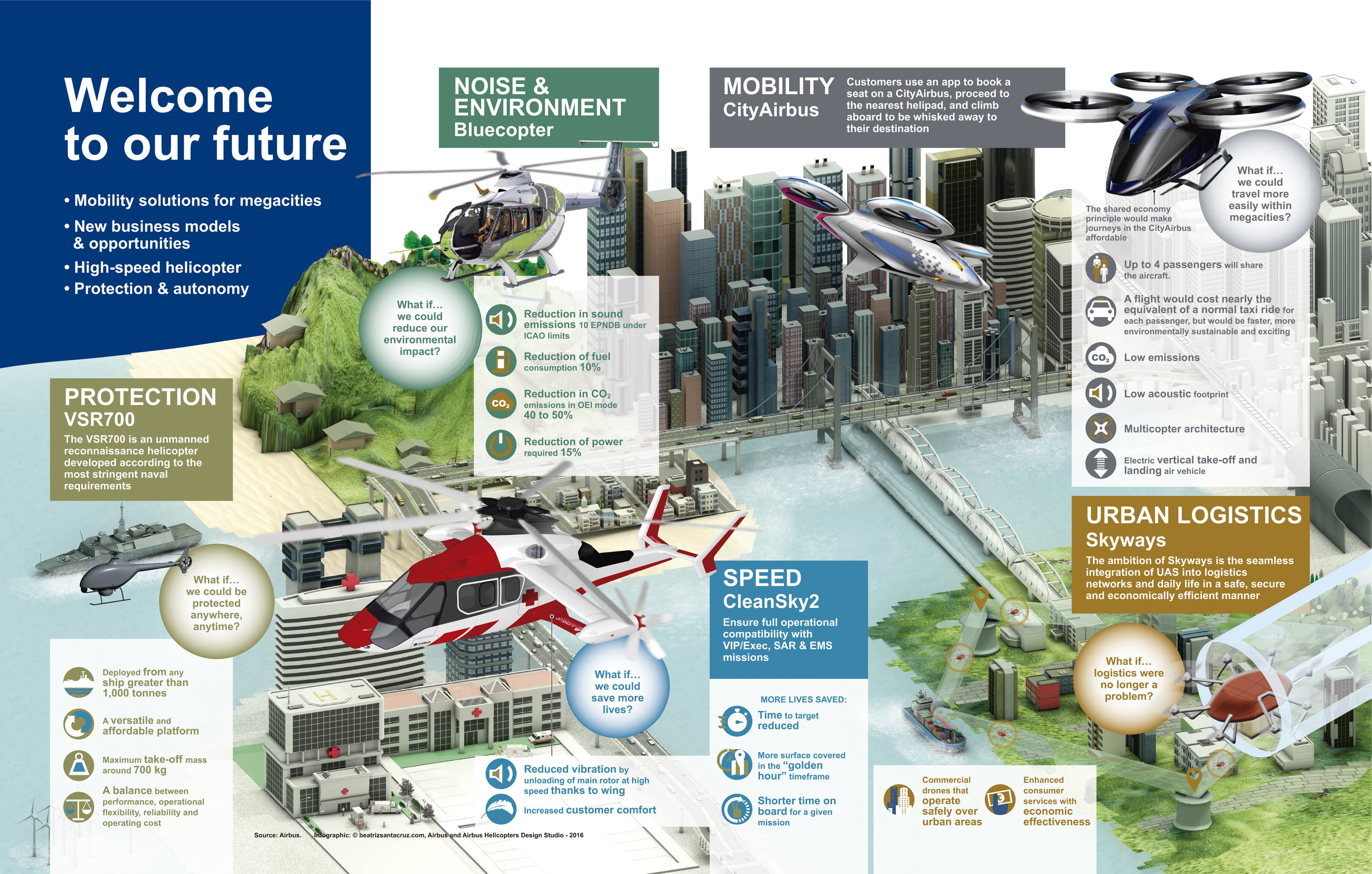 J-B. D.: You do have to be visionary and stay on your toes. Let’s take urban mobility as an example. This is an area that Airbus is monitoring closely. The CityAirbus flying taxi demonstrator that we are working on is an original solution for the future, one with the potential to revolutionise the way in which the inhabitants of major conurbations get around. Their dream is to escape the hazards posed by gridlocked streets. We are playing an active part in studies into this topic, working on the transporter, powerplant, operations and the business model. In terms of drones, we are looking at every possible avenue. We are, for example, working with the Singaporean authorities on an experimental project called Skyways, which seeks to develop an unmanned aircraft system for delivering packages in urban environments. We have also reached a very advanced stage with the VSR700, a military drone developed in conjunction with Hélicoptères Guimbal. Another concept we firmly believe in is the speed capability of the Clean Sky 2 demonstrator, the successor to the X3, known as Racer. The technical solution we have put forward is very appealing because it is simple and inexpensive. It is an illustration of perfect innovation, which is innovation based on reality.