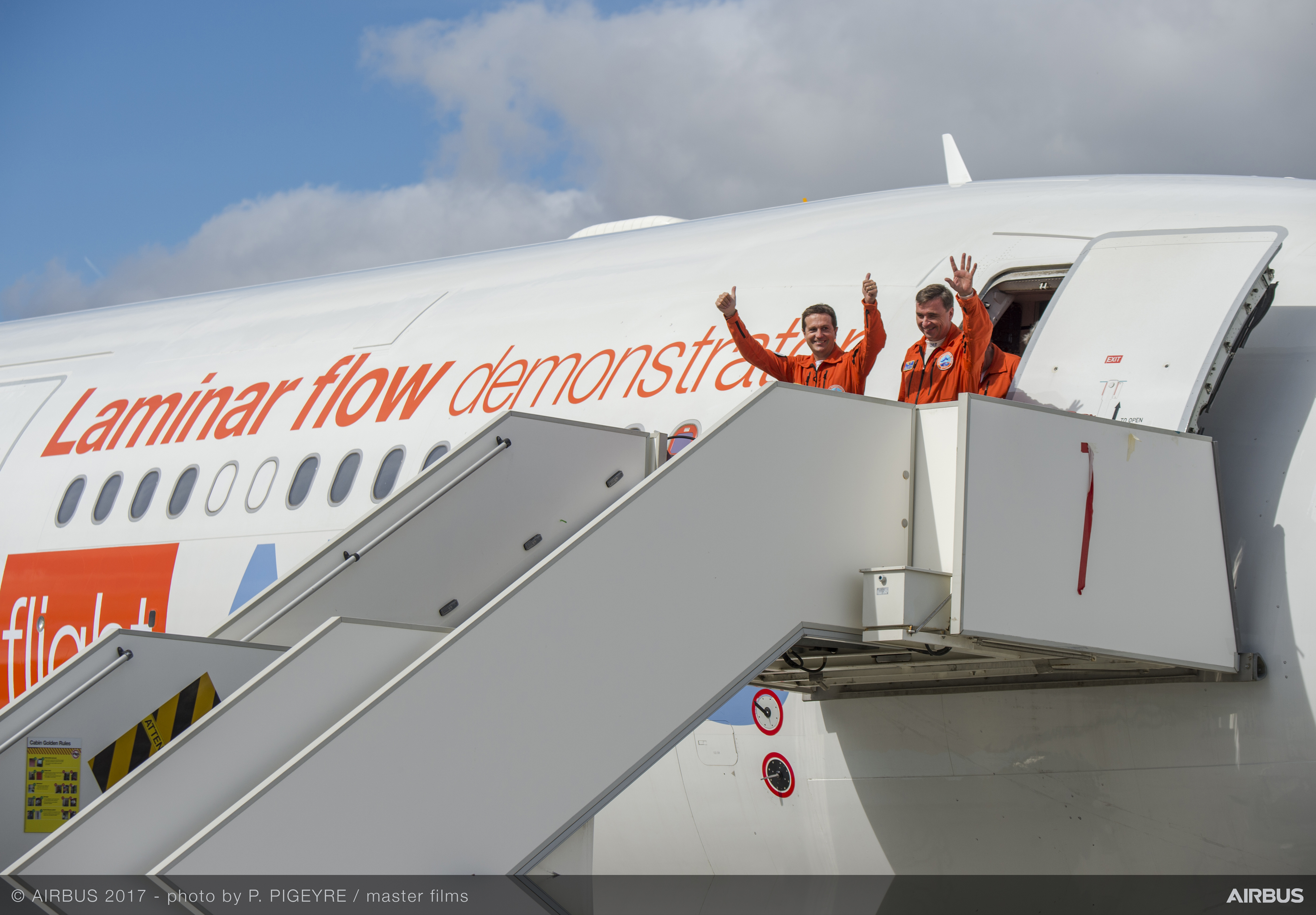 Today’s milestone was the Airbus A340 Flight Lab’s first takeoff equipped with outer wing sections designed for highly smooth airflow over their surfaces. Known as natural laminar flow, such smoothed passage of air creates less drag than the airflow on traditional wings, potentially reducing fuel burn by as much as 4.6 percent on an 800-nautical mile trip.
