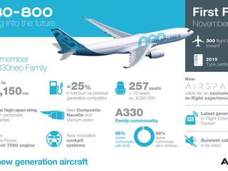 As the second member of the A330neo Family, the A330-800 is the most efficient, longest-range entry-level widebody aircraft. It joins the longer-fuselage A330-900 variant, which offers the lowest seat-mile cost in midsize widebody category and will soon be entering airline service with launch operator TAP Air Portugal.