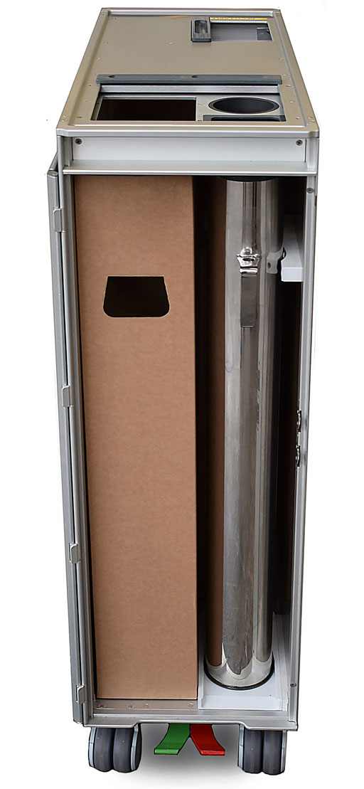 The Retrolley has several different compartments that can be customised according to airlines’ specific needs. They were created with flexibility in mind, and possible configurations have many variations, such as one container for stacked-up cups, another for liquids, one more to hold recyclable paper and plastics, and a fourth slot for trash that cannot be easily recycled.