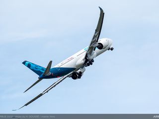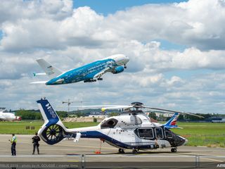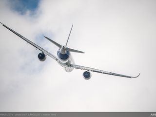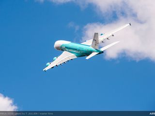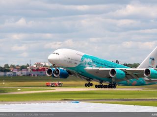 From Airbus’ smallest single-aisle jetliner – the A220, to the world’s largest passenger airplane –the A380, the company’s commercial aircraft family had a high-profile presence at this week’s Paris Air Show. An A380 utilised by Portuguese leasing specialist Hi Fly was a crowd-pleaser during today’s flying display, while an A220-300 in the colours of Latvian operator airBaltic was included in Airbus’ exhibit area at Le Bourget Airport.