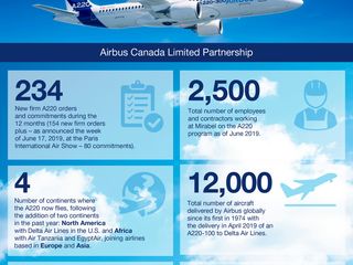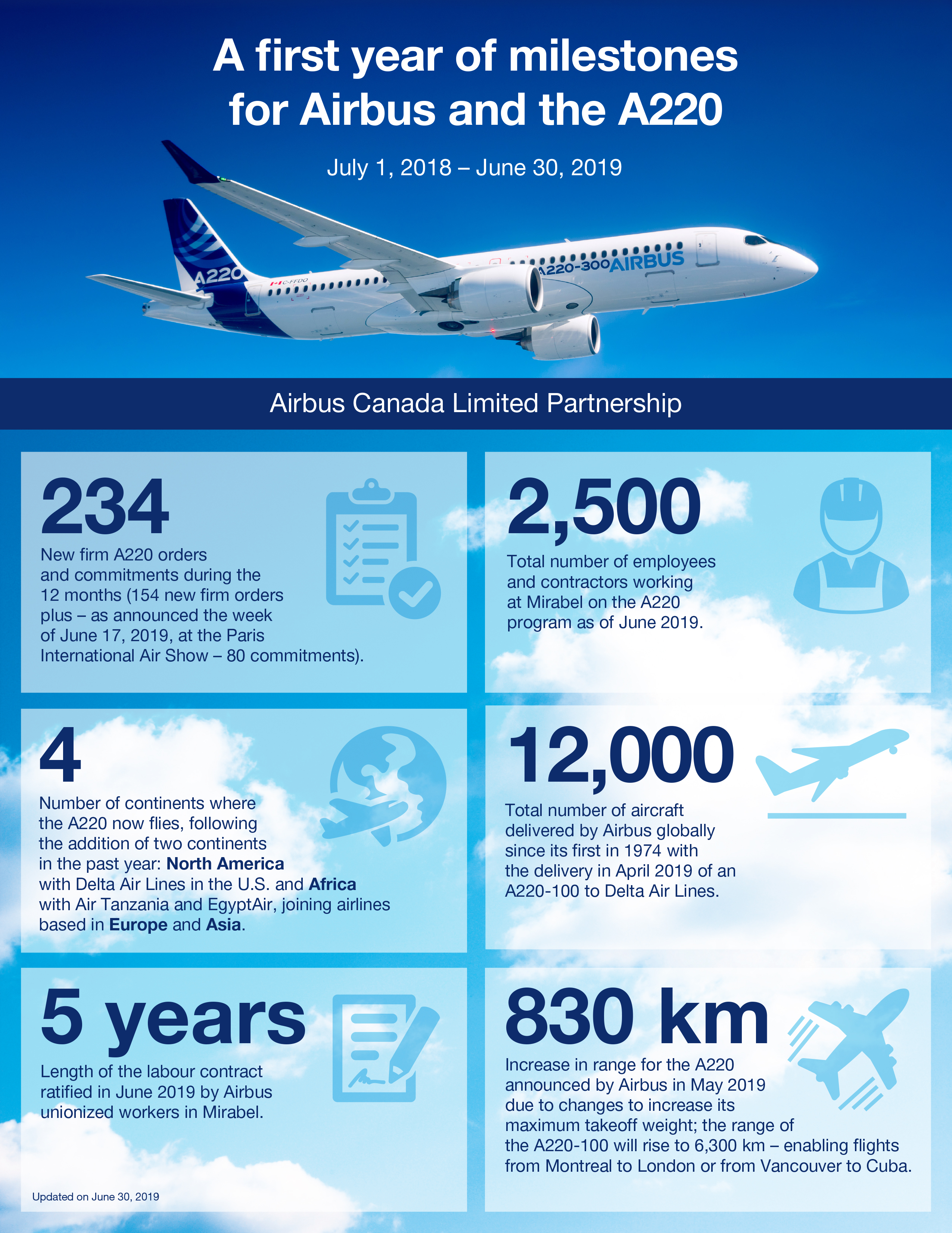 Highlights of this first anniversary include orders and commitments signed for more than 230 A220 aircraft, the ground-breaking for a new A220 manufacturing facility in Mobile, Alabama, and expansion at the Mirabel manufacturing facility. Airbus Canada has delivered more aircraft in its first year than the total delivered up to July 1, 2018, when it took the lead of the program.*