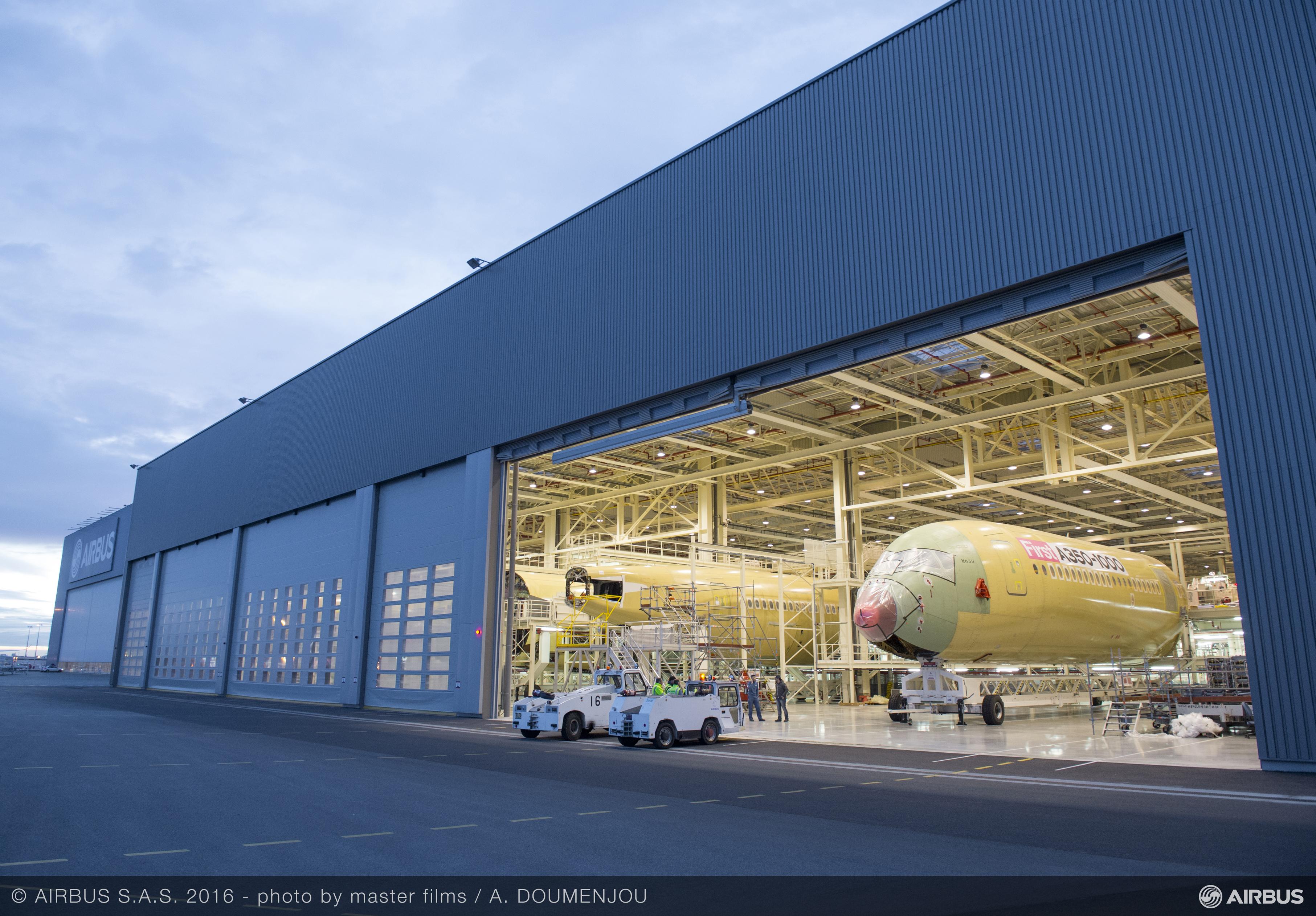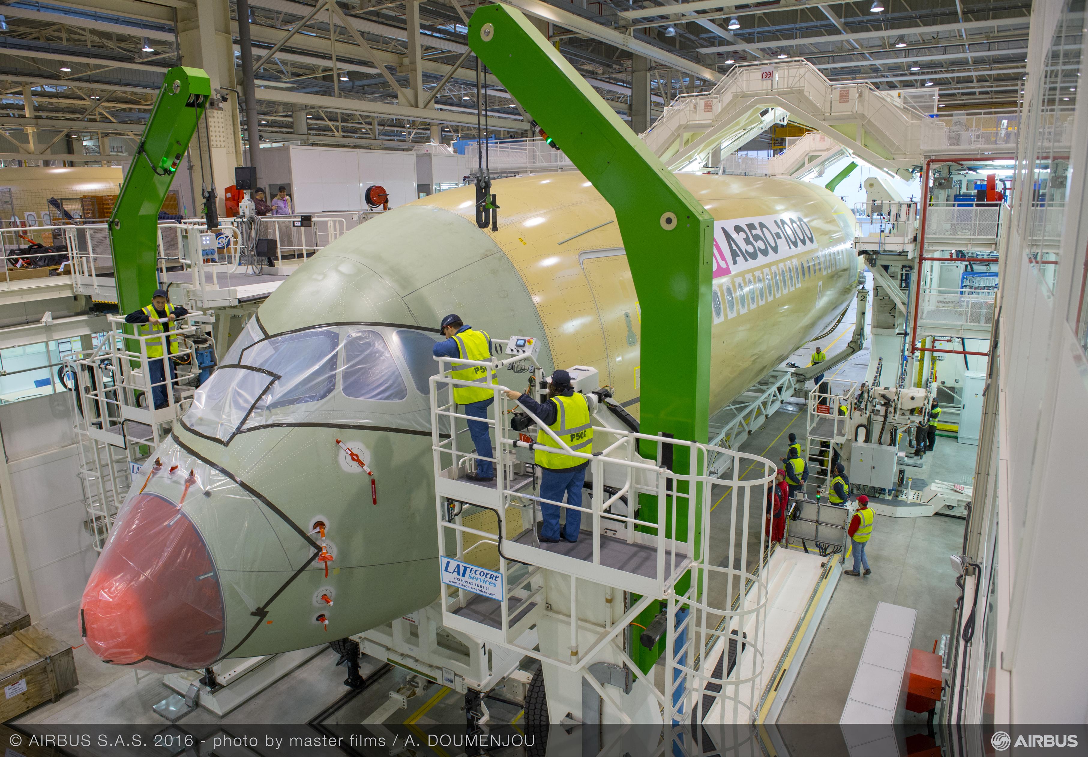 Currently in “Station 50” for fuselage join-up and nose landing gear installation, the first A350-1000 will next move to “Station 40” where the wings, main landing gear, pylons and tail planes will be installed. To save time and optimise the A350 assembly process, Airbus starts the cabin furnishing and first electrical power-on in parallel to the structural assembly work. After this stage is completed, the aircraft continues through the FAL process, with final structural activities, ground tests, painting, cabin & cockpit completion and engines installation before being transferred to the flight test centre.