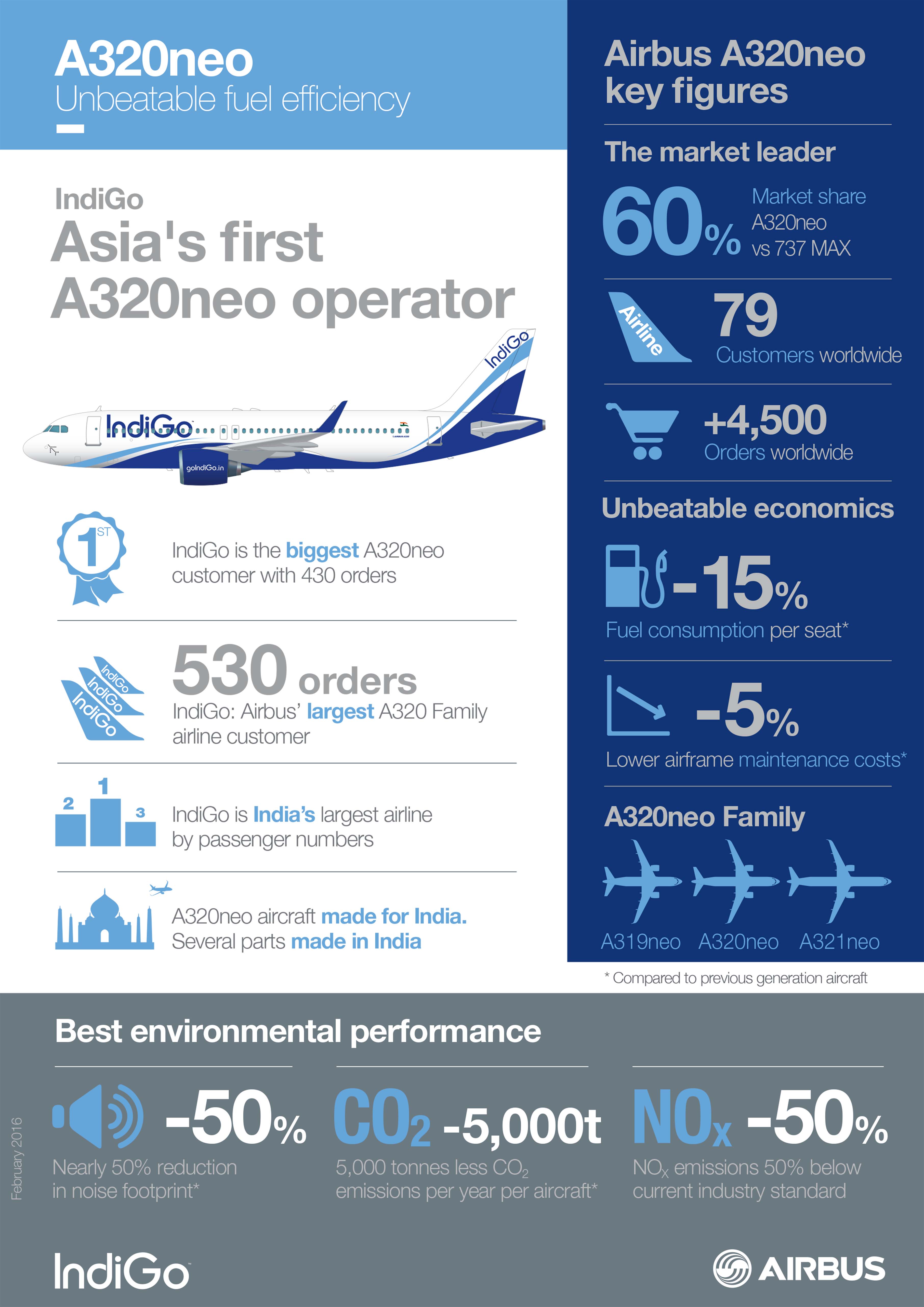 “It fills us with pride that IndiGo, India’s largest airline and the biggest customer for our A320neo, has taken delivery of its first aircraft. On top of best in class operational efficiencies and environmental benefits, the A320neo will offer IndiGo’s passengers unmatched comfort,” said Dr. Kiran Rao, Airbus EVP Strategy and Marketing.