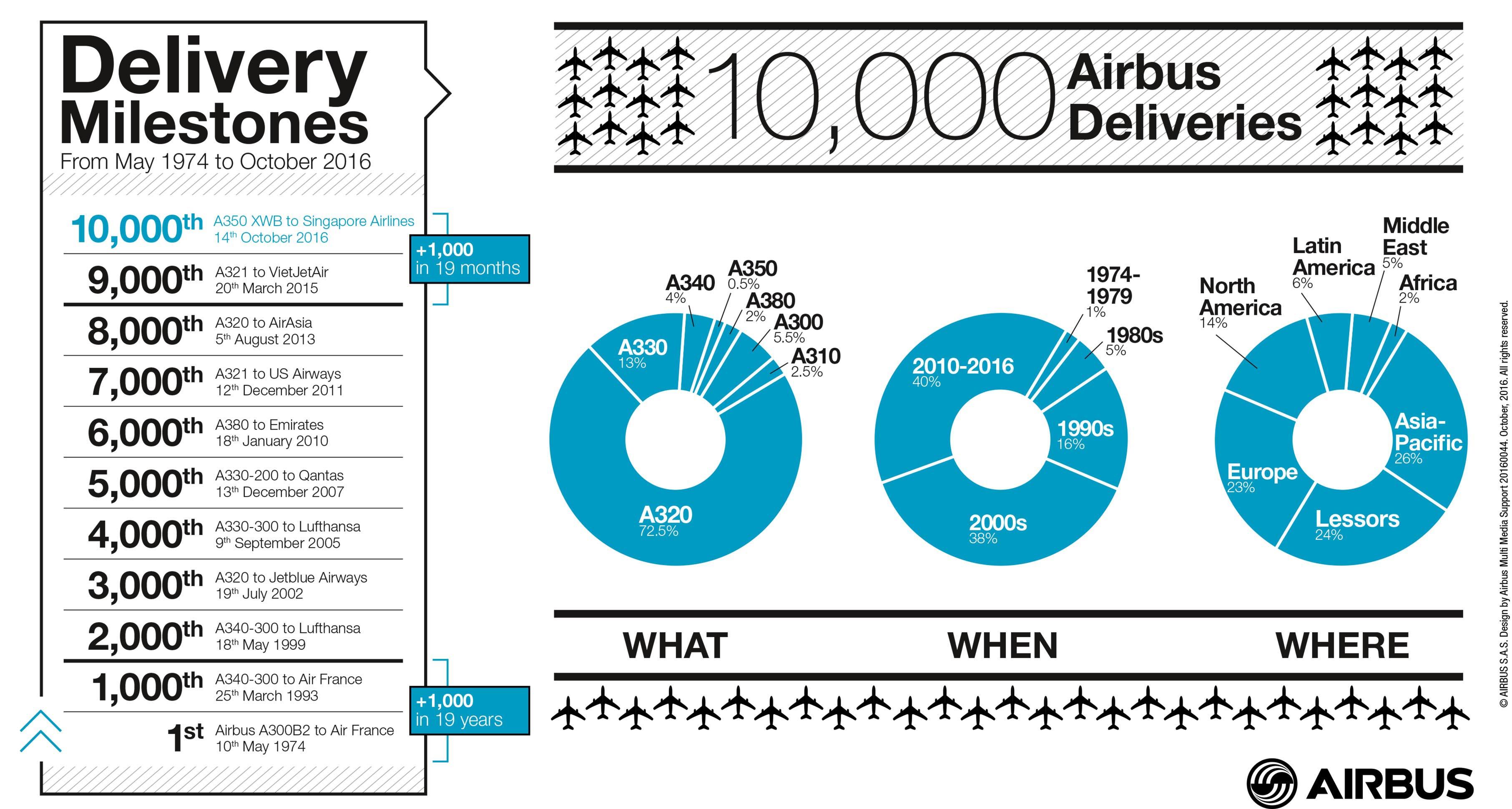 The 10,000th Airbus delivery comes as the manufacturer achieves its highest level of production ever and is on track to deliver at least 650 aircraft this year from its extensive product line. These range from 100 to over 600 seats and efficiently meet every airline requirement, from high frequency short haul operations to the world’s longest intercontinental flights.