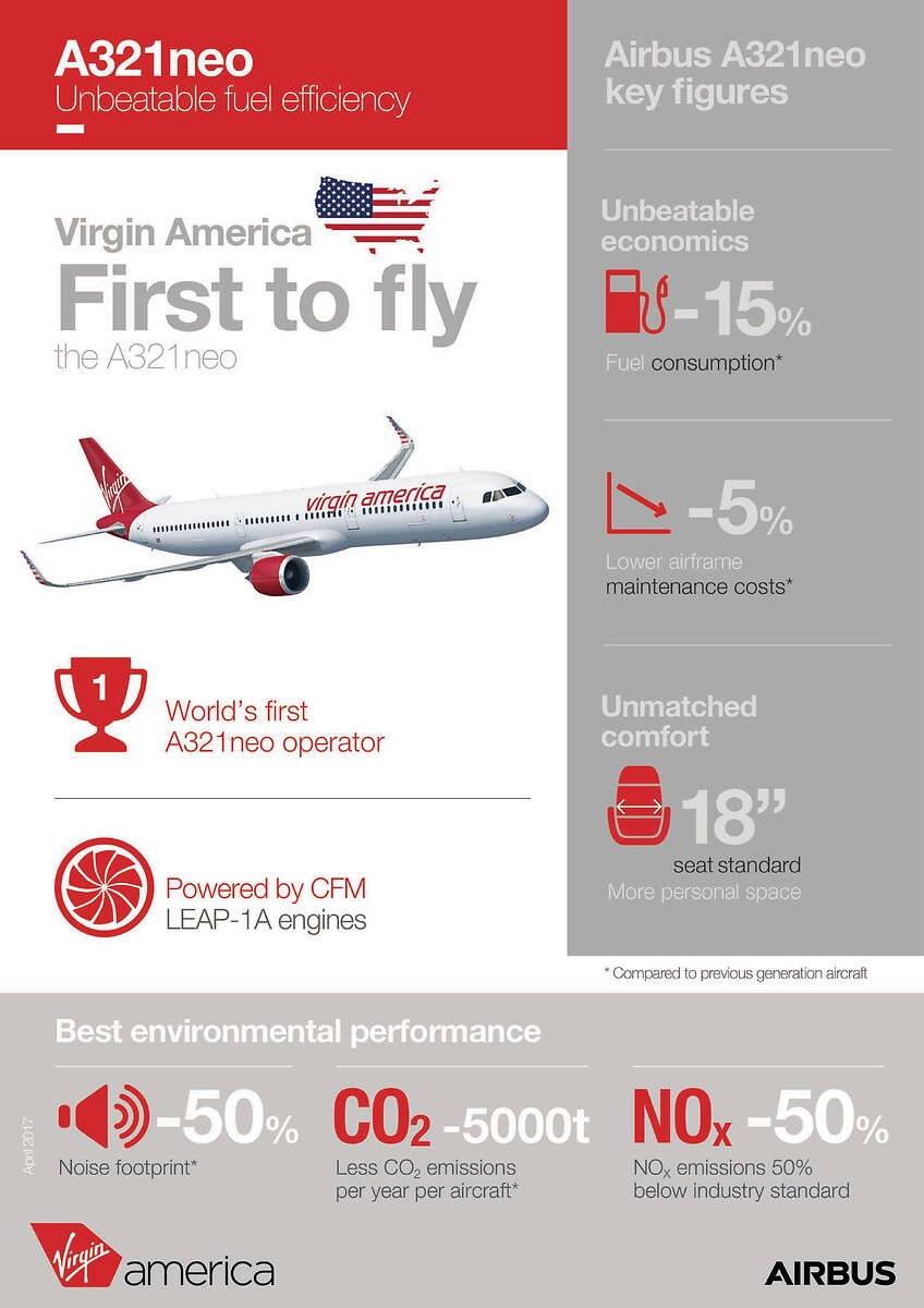 Virgin America currently operates a fleet of 63 Airbus A320 family aircraft comprised of A319ceo and A320ceo aircraft powered by CFM’s CFM56-5B engines. The new A321neo will become the largest aircraft in Virgin America’s fleet, featuring 185 seats - a 24 percent higher capacity at same comfort levels than its current A320s. Inside the cabin, Virgin America flyers will continue to enjoy three custom-designed classes of service, touch-screen personal entertainment and an on-demand food and cocktail menu on every flight in addition to power outlets at every seat.