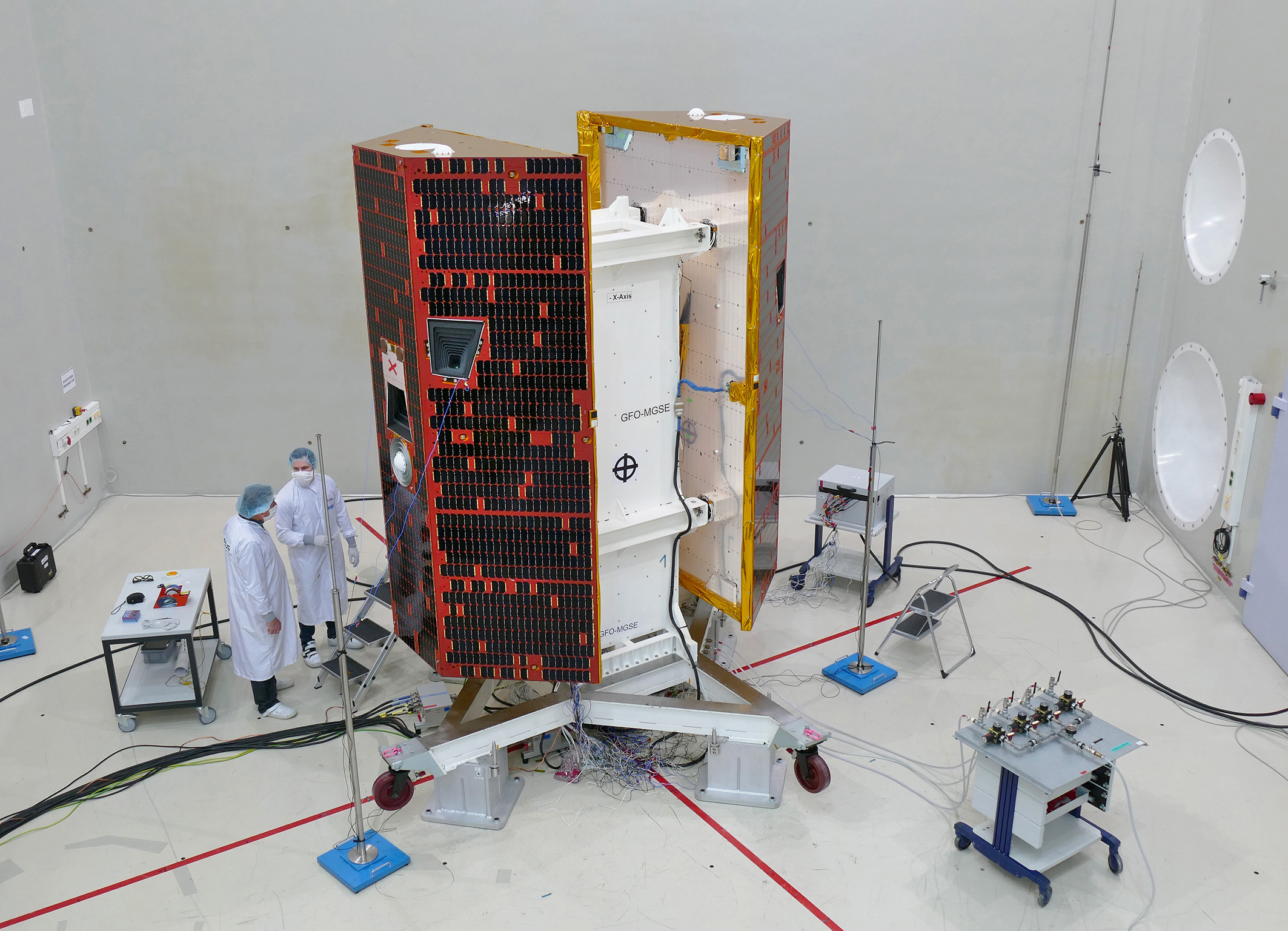 Preparations for the acoustic noise test for the two GRACE-FO satellites, which Airbus constructed for NASA/JPL. Photo: Airbus DS GmbH / Mathias Pikelj