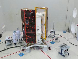 The sound impact that builds up during rocket launches was simulated in an echo chamber with a volume of around 1,400 m³ at IABG in Ottobrunn near Munich. In four test cycles, the satellites in their flight position were subjected to a sound impact of nearly 140 decibels (dB). In comparison, a pneumatic drill produces 100 dB and the human pain threshold is 130 dB. Both satellites passed the tests with flying colours.