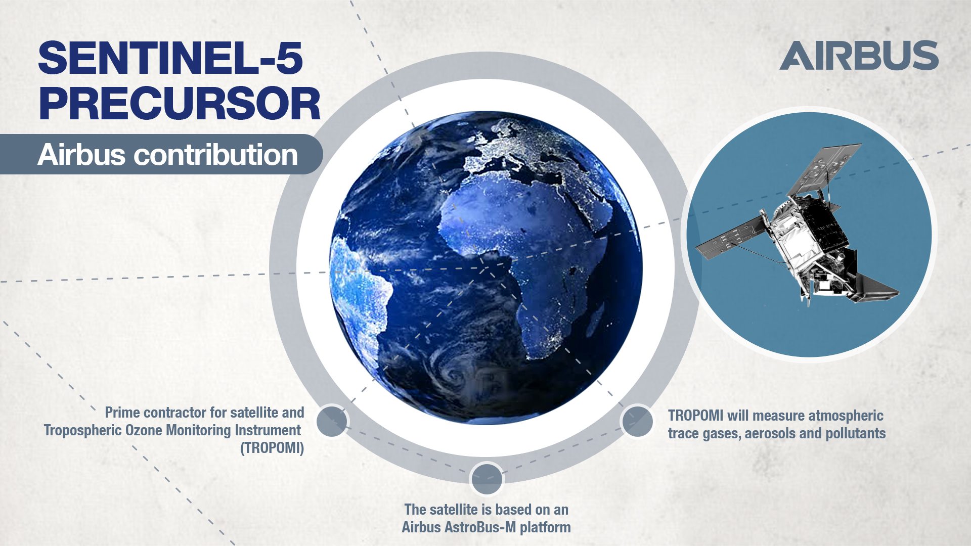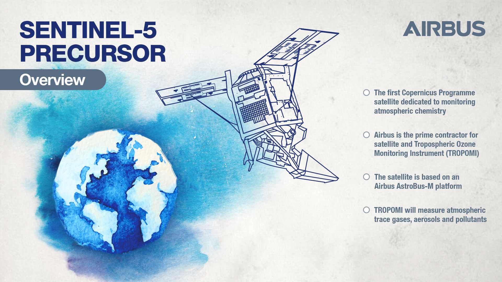 Colin Paynter, Managing Director of Airbus Defence and Space in the UK said: "For Sentinel-5 Precursor we used the commercially successful AstroBus platform, enabling us to meet challenging delivery and cost efficiency targets. This mission will give Europe new way to measure global pollution levels in much greater detail."