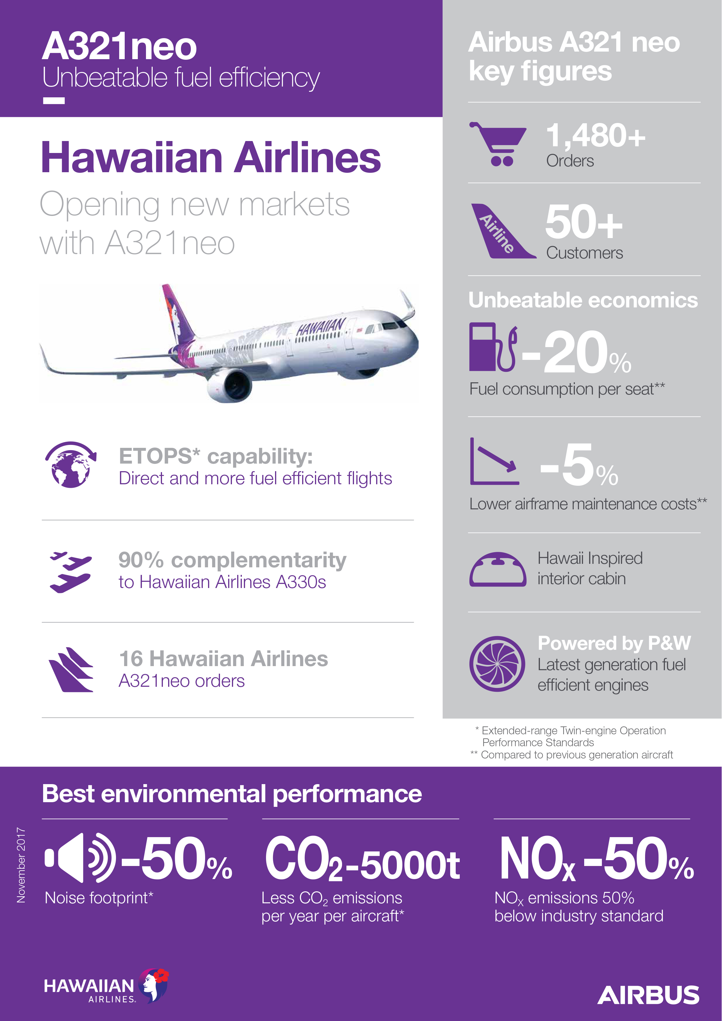 Powered by Pratt & Whitney PurePower engines and ETOPS (Extended-range Twin-engine Operations) certified for lengthy overwater flights, the A321neo will allow Hawaiian to fly more direct and fuel-efficient routes.