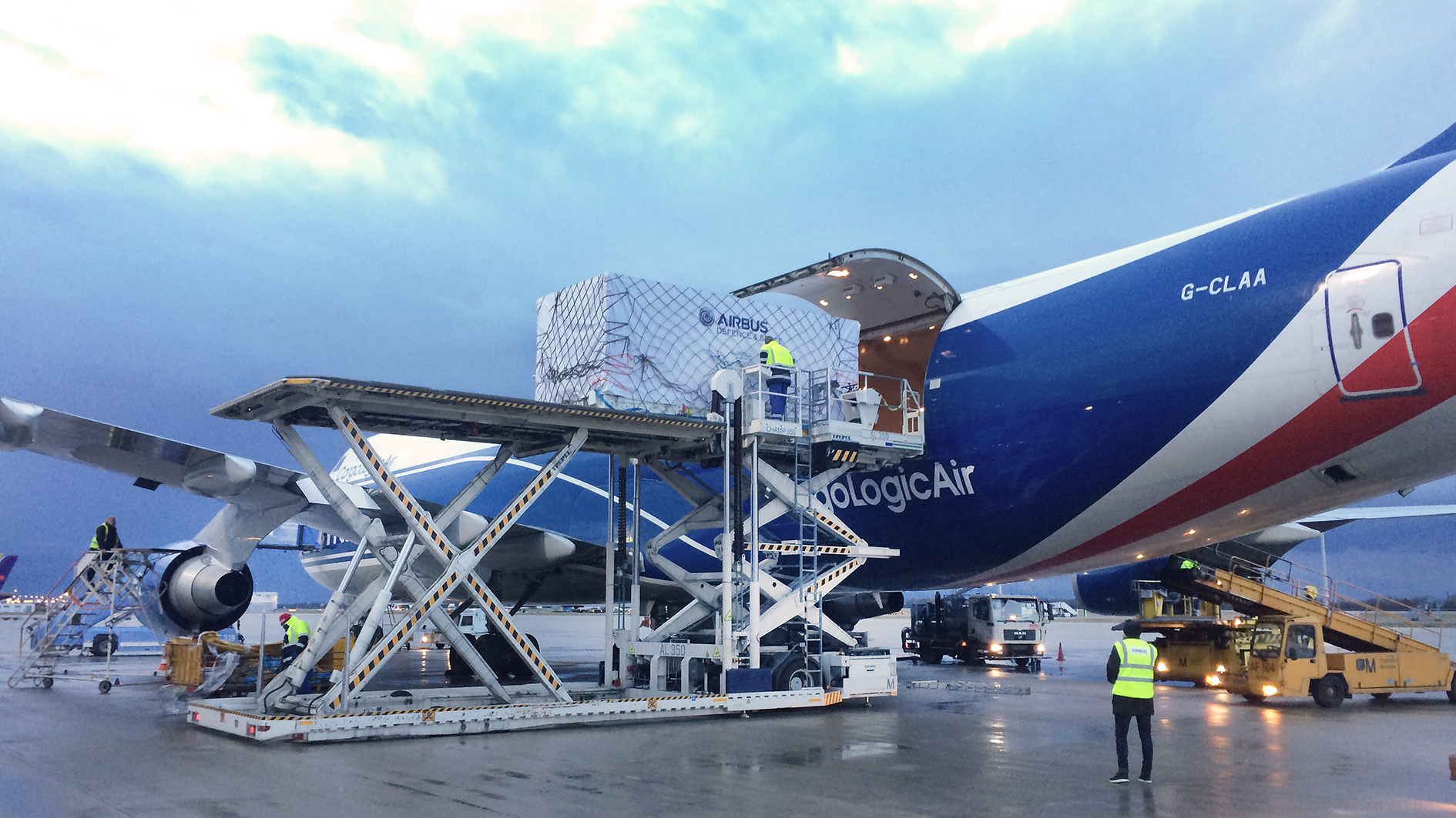 Munich/Friedrichshafen, 12/12/2017 – The twin GRACE-FO satellites have now set off on their journey to Vandenberg Air Force Base in California. Together with test equipment totalling around 45 tonnes, the gravity research satellites built and developed by Airbus in Friedrichshafen (Germany) were loaded overnight onto an air freighter at Munich airport and flown to the USA this morning. GRACE-FO is a joint project between NASA’s Jet Propulsion Laboratory (JPL) based in Pasadena, California, and the German Research Centre for Geosciences (GFZ) in Potsdam.