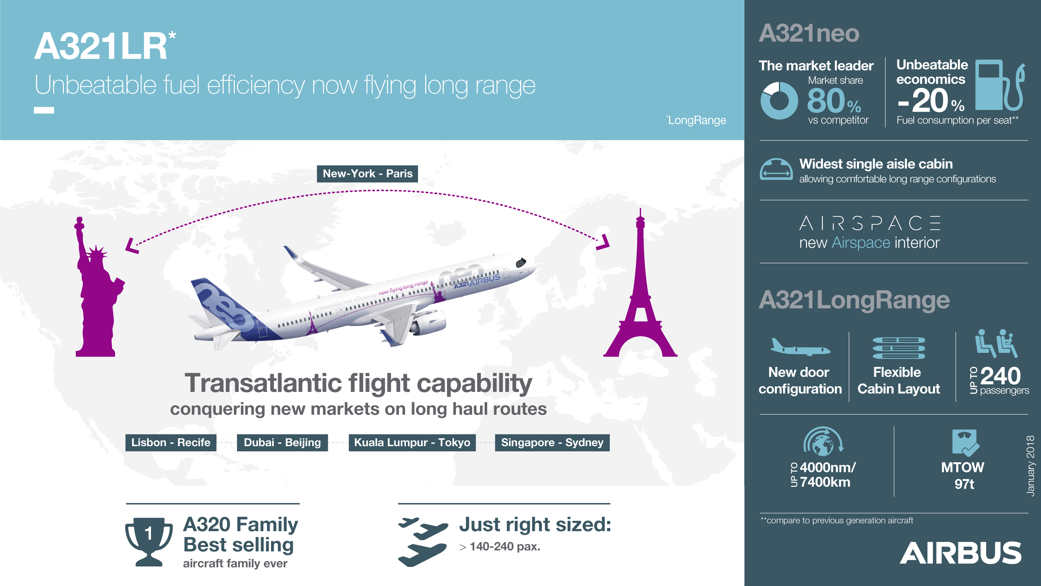 Klaus Roewe, Head of A320 Programme stated: “Thanks to its outstanding performance and unbeatable efficiency, the A321LR will allow our customers to perform flights of up to 4,000nm, allowing them to open new routes – for example transatlantic - and conquer new markets.”