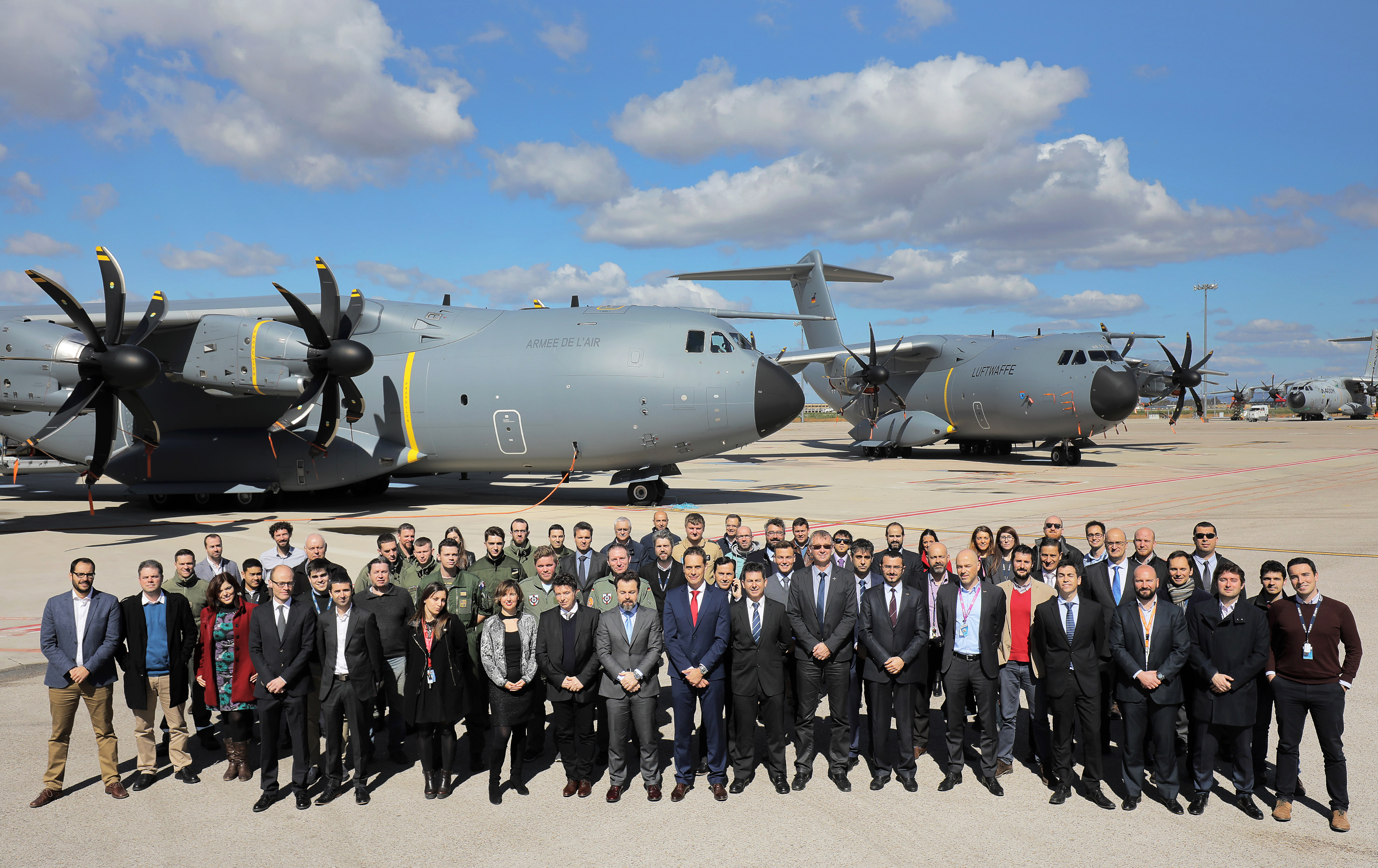 Seville, 22 March 2018 – Airbus has for the first time formally delivered two A400M new generation airlifters to two different nations in one day. The company handed over the aircraft on 20 March to the European Organisation for Joint Armament Cooperation (OCCAR), in charge of the management of the A400M Programme, representing Germany and France – at a ceremony in Seville, Spain. OCCAR Director Arturo Alfonso-Meiriño said: “It is a great pleasure to see two of the leading OCCAR nations receiving these superb aircraft on the same day in a year when the organisation is itself celebrating the 20th anniversary of the signature of its Convention. This is testimony to the effective work performed by OCCAR’s A400M team over many years in managing this exceptionally complex programme.” These latest deliveries were the 60th and 61st A400Ms to be handed over and take the German and French fleets to 18 and 14 aircraft respectively. The photo shows the Airbus and OCCAR delivery teams, and French and German crews in front of the two aircraft following the official handover ceremony.