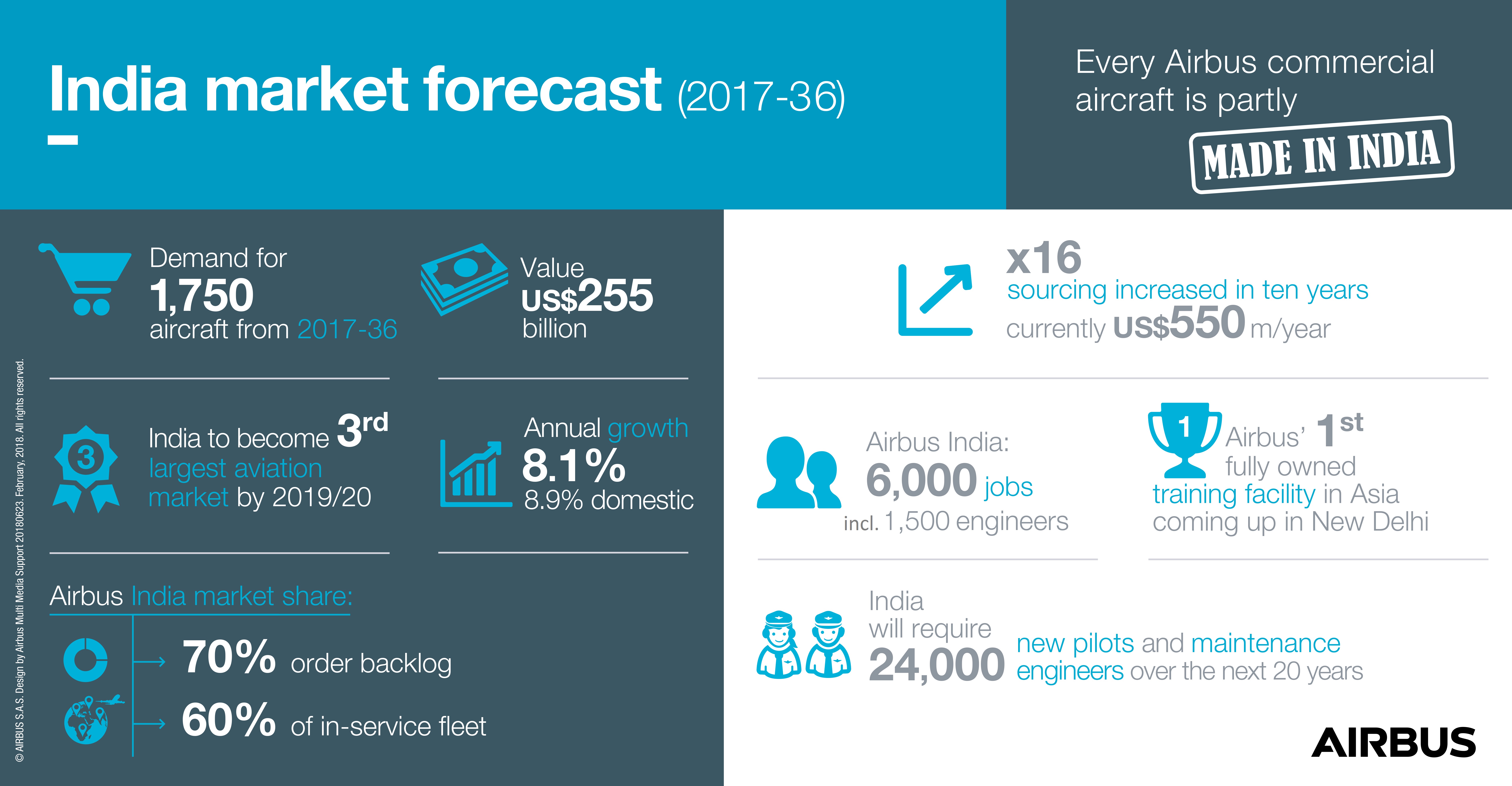 India is set to become the world’s third-largest aviation market by 2019/2020 and Airbus is well positioned to partner its growth with backlog orders of over 530 aircraft to date.