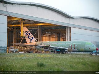 Following the start of final assembly work in April, ANA’s (All Nippon Airways) first A380 has completed airframe assembly and today made its debut in Toulouse. With the ANA logo on its vertical tail, the aircraft has moved to an outdoor station where structural completion, engine installation and cockpit furnishing will be conducted. System testing for electric power, hydraulic power, and air conditioning, will be also conducted.