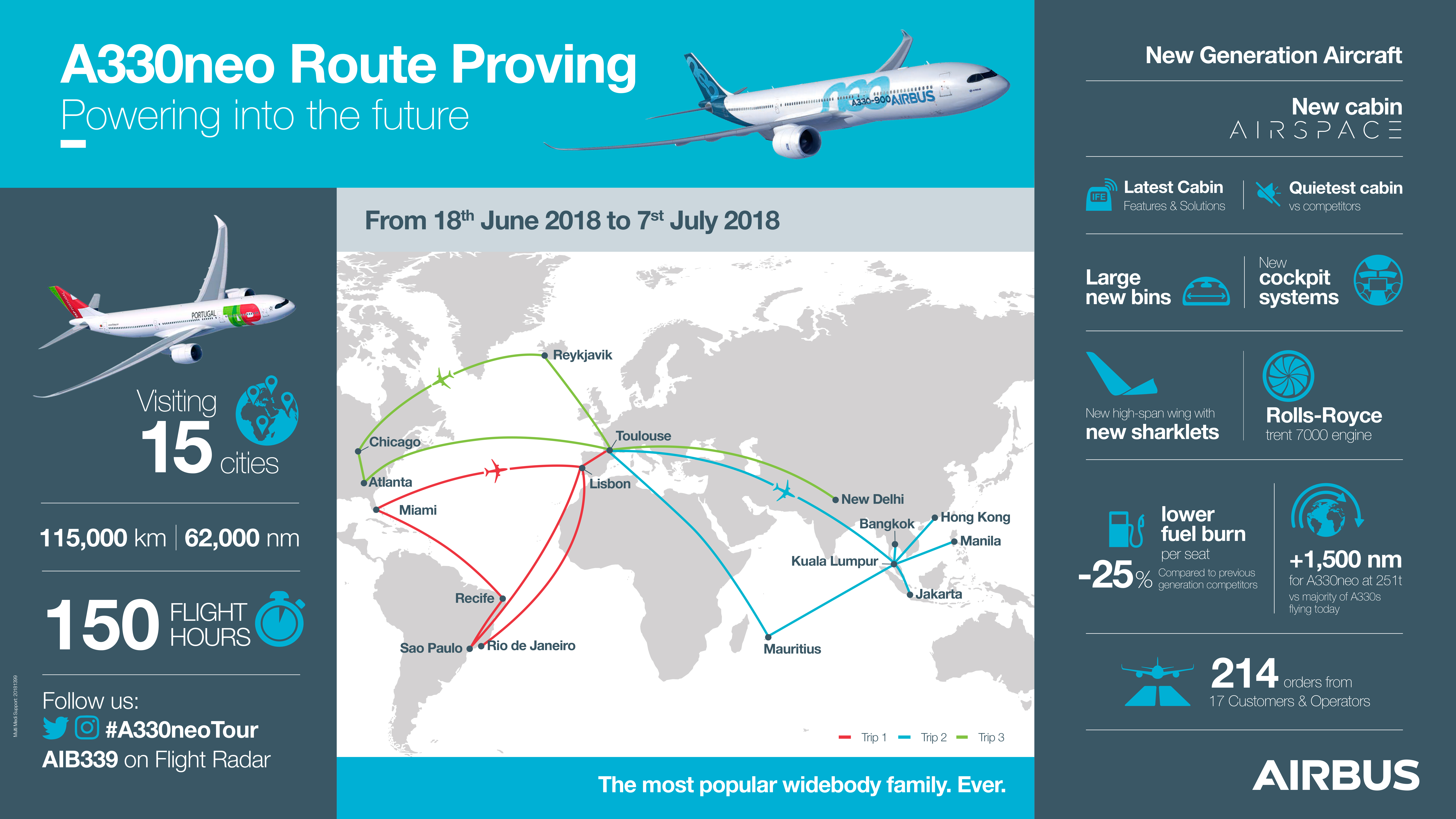 The A330neo, Airbus’ newest widebody aircraft, has embarked on a worldwide tour to demonstrate its readiness for airline operations. As a final step in the aircraft certification phase, these function and reliability tests, also known as route proving, will include ETOPS (Extended-range Twin-engine Operational Performance Standards) missions, landing at diversion airports and testing airport handling services. After a fly-past over Airbus’ European sites, the A330neo will head for 15 major airports worldwide over five continents, aiming at achieving 150 flight test hours in three trips.