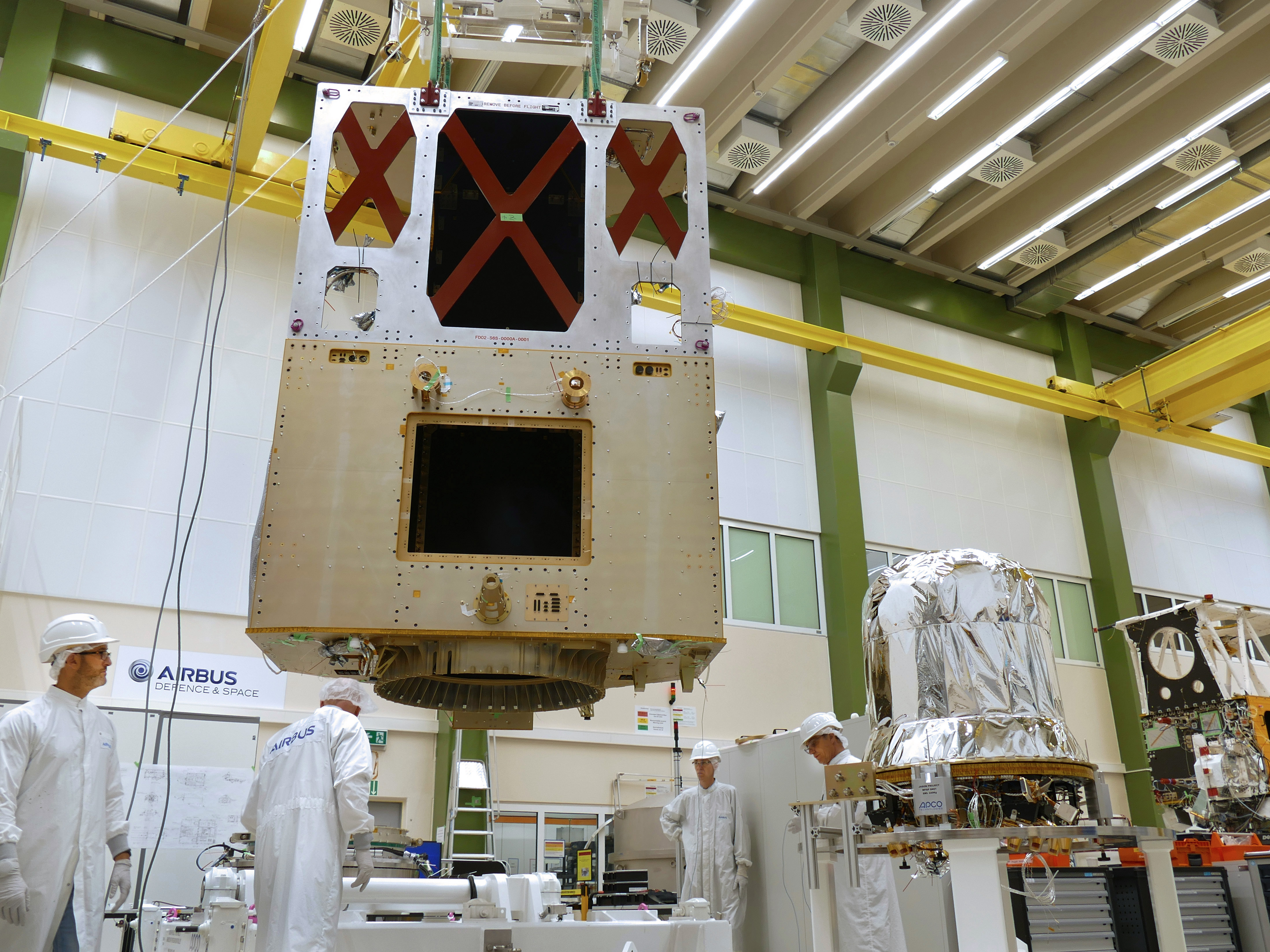 Friedrichshafen, 30/08/2018 – The integration of Sentinel-6A, the first of two satellites to continue measuring sea levels from 2020, has reached a new milestone and its critical phase: the propulsion module has been “mated” with the main structure of the satellite at Airbus.
