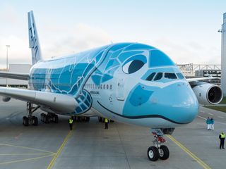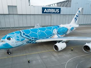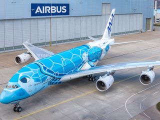 The three ANA A380s will be painted in a special livery depicting sea turtles which are native to Hawaii. The first aircraft is blue, the second will be green and the third orange. The ANA A380 livery is one of the most elaborate ever painted by Airbus. It took 21 days for the Airbus team to paint a surface of 3,600m2 using 16 different shades of color.