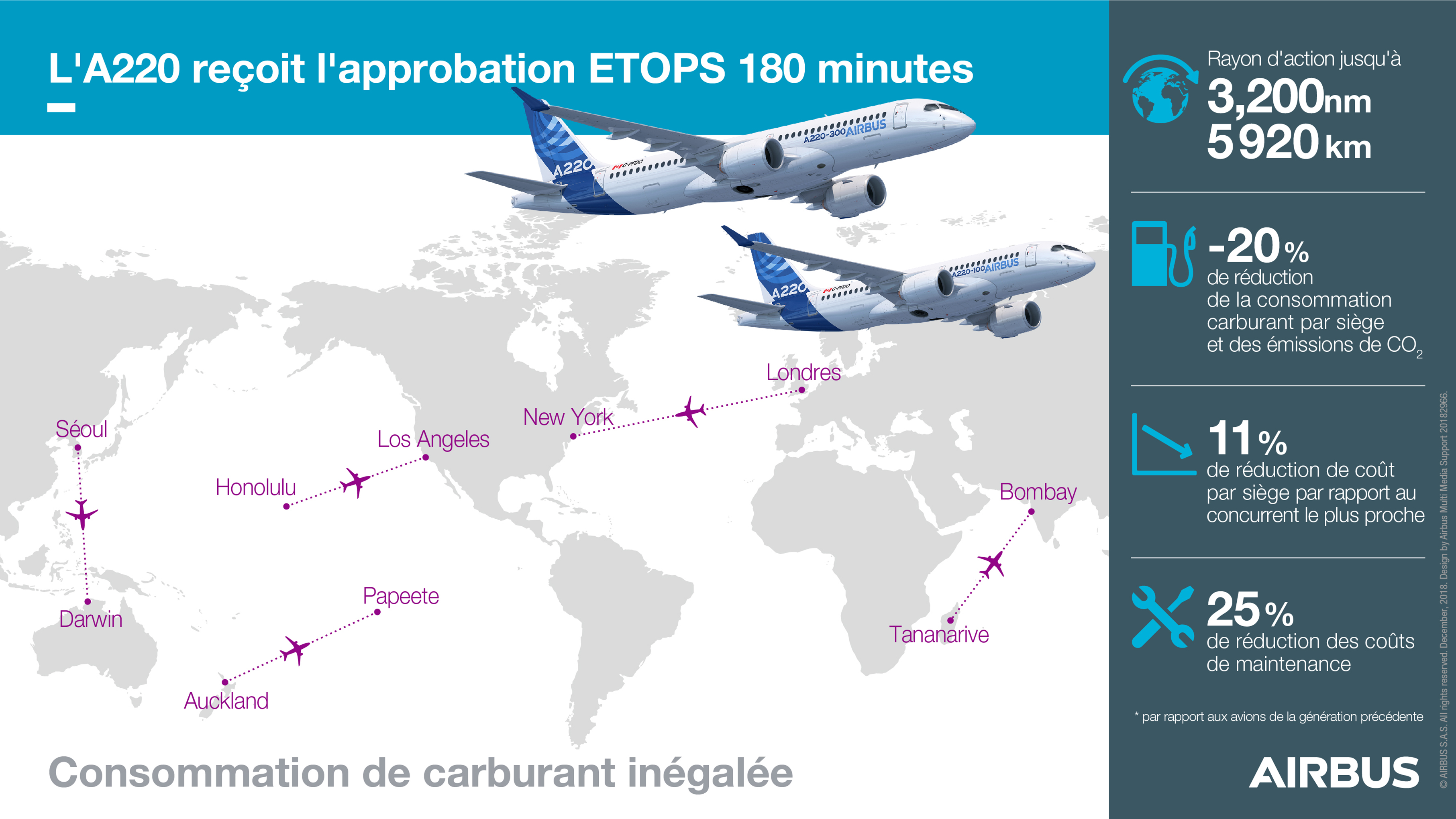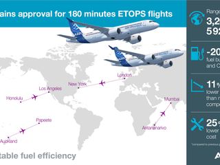 The newest addition to the Airbus family of commercial aircraft, the A220, has received 180-minute extended operations (ETOPS*) approval from the Canadian civil aviation authority, Transport Canada. This achievement paves the way for A220 customers to start new direct non-limiting routings over water, remote or underserved regions.