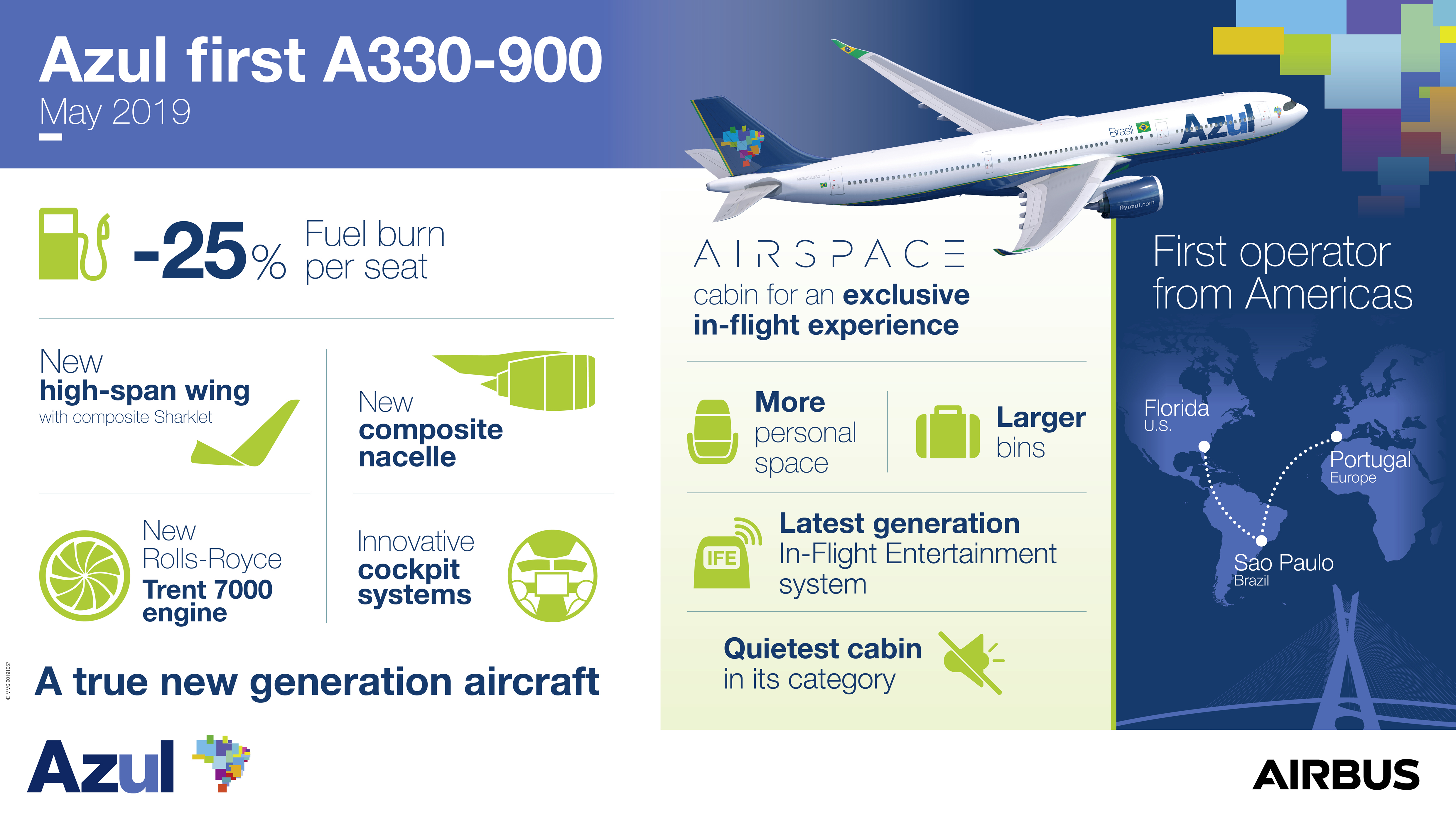 “We are very proud to be the first A330neo operator in the Americas. This new aircraft will play a key role in the expansion of our international markets supporting our strategy of having a modern and fuel-efficient fleet,” celebrated John Rodgerson, Azul’s CEO.