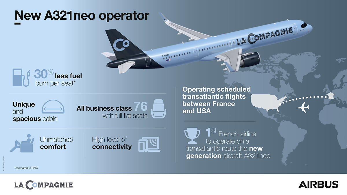 The first single-aisle A321neo destined for La Compagnie, an exclusively business-class French airline operating scheduled transatlantic flights, will commence transatlantic services on 6 June from Paris Orly Airport to Newark Liberty International Airport.