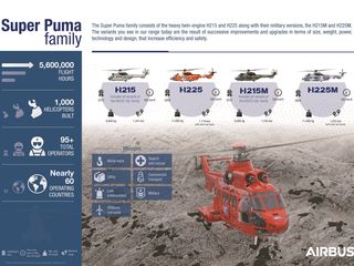 Today, the Super Puma is operated by nearly 100 customers in 59 countries representing all regions of the world. The Super Puma family is composed of the H215 and H225 for the civil market, produced by Airbus Helicopters for law enforcement, aerial work, search and rescue, offshore transport and governmental missions, and appreciated for their versatility and ability to operate in extreme environmental conditions. In the military sector, Airbus Helicopters offers the H215M and H225M for search and rescue, troop transport, special ops and utility missions, among others.