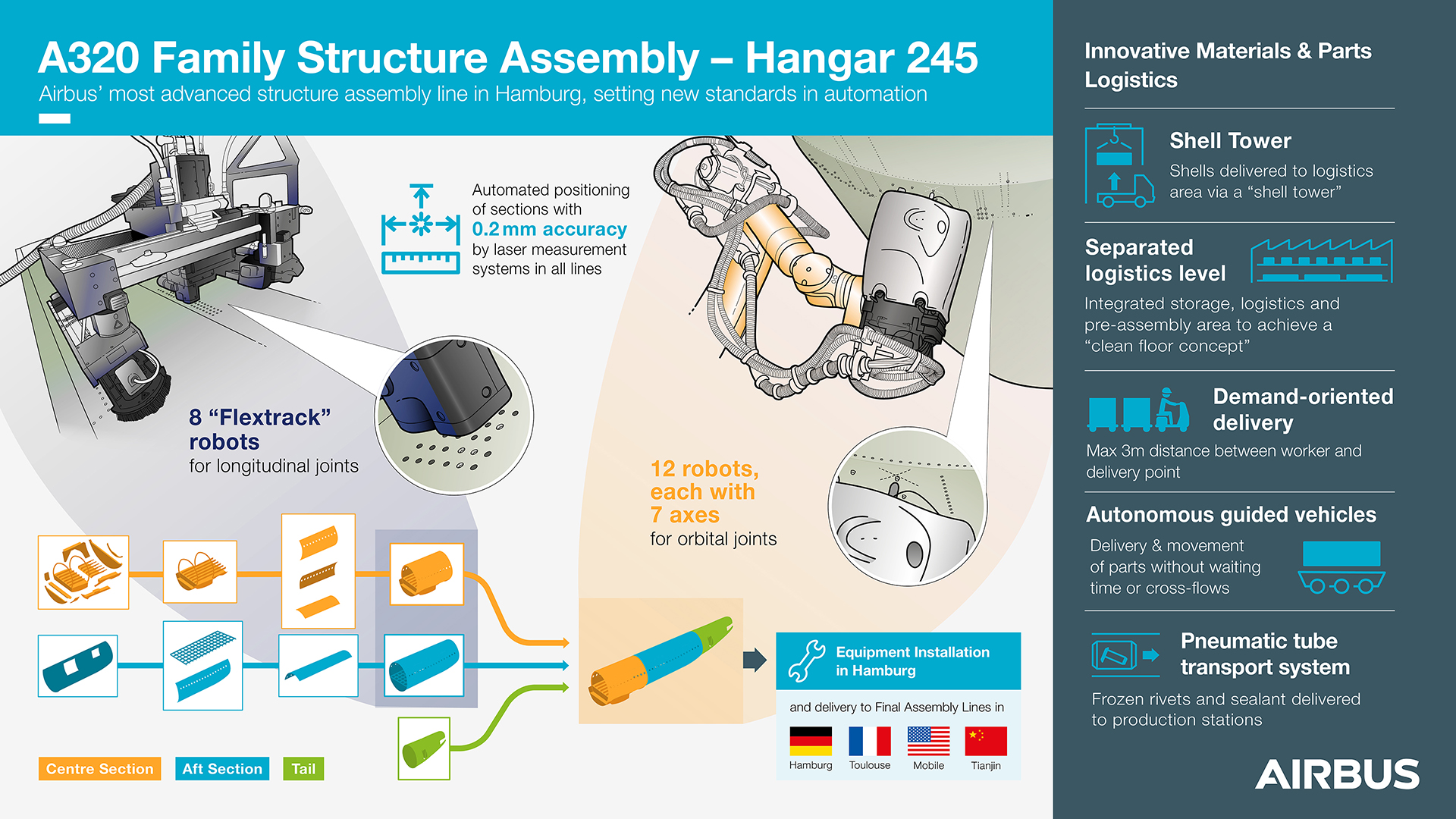 The Hamburg structure assembly facility is responsible for joining single fuselage shells into sections, as well as final assembly of single sections to aircraft fuselages. Aircraft parts are equipped with electrical and mechanical systems before eventually being delivered to the final assembly lines in France, Germany, China and the U.S.