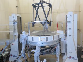 After mounting the truss on the base plate, both made of silicon carbide, Airbus is now completing the final phase of integration: the optical alignment. The telescope will then be sent to Thales Alenia Space, where it will go through further testing and be integrated with the platform.