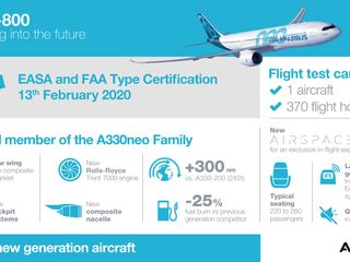 Toulouse, 13th February 2020 – The A330-800 has received joint Type Certification from the European Aviation Safety Agency (EASA) and the Federal Aviation Administration (FAA). The aircraft’s certification flight-test campaign was successfully performed by aircraft MSN1888, which completed the programme in 370 flight test hours and 132 flights since its first flight in November 2018.