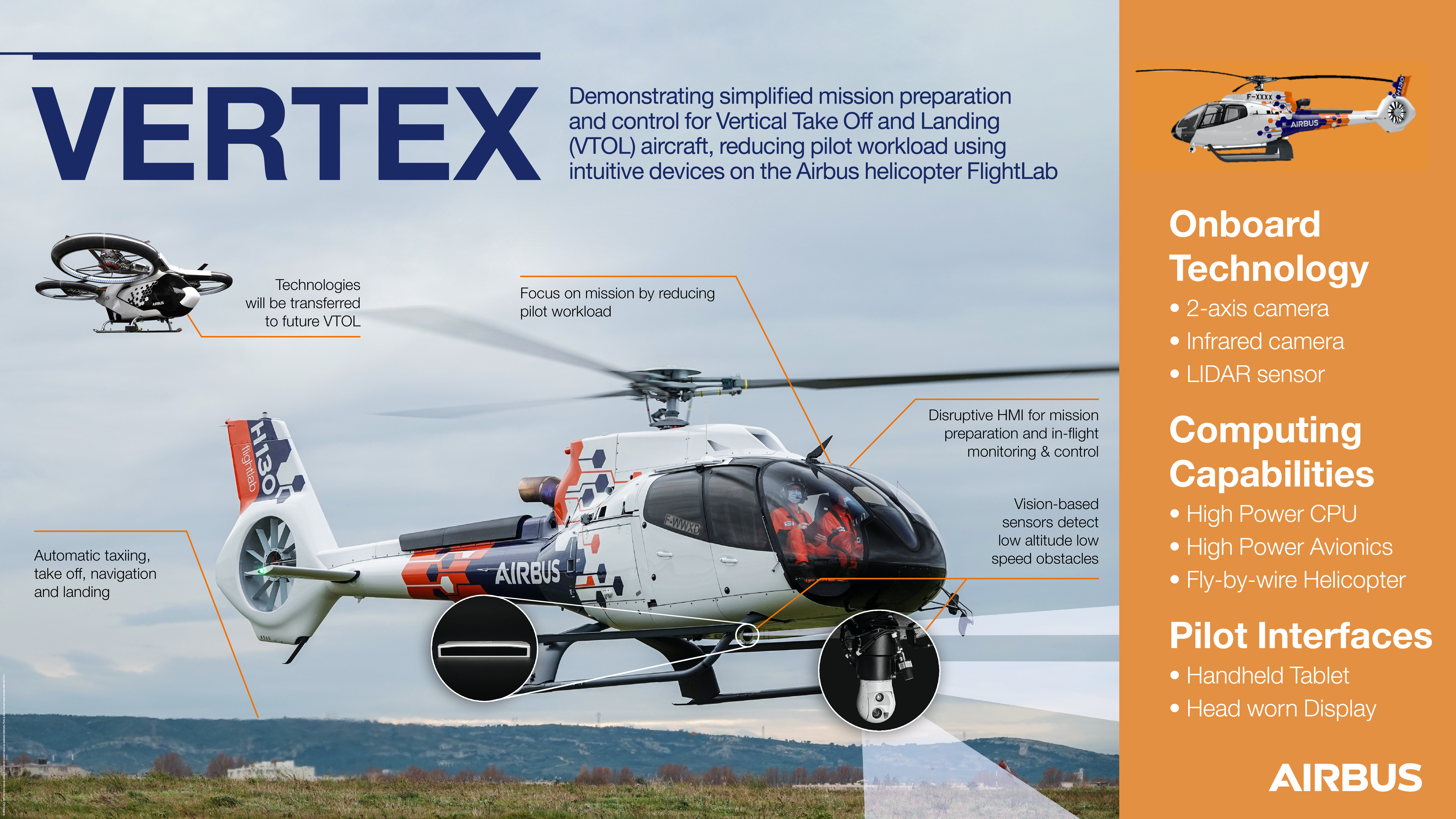 “We are excited by the potential that the Vertex demonstrator project has to offer,” said Grazia Vittadini, Chief Technology Officer, Airbus. “By using our platform-agnostic flying laboratory to mature these technologies, we have an agile and efficient test bed that will support the development of future autonomous systems that could later equip Airbus’ current helicopter range and (e)VTOL platforms.”