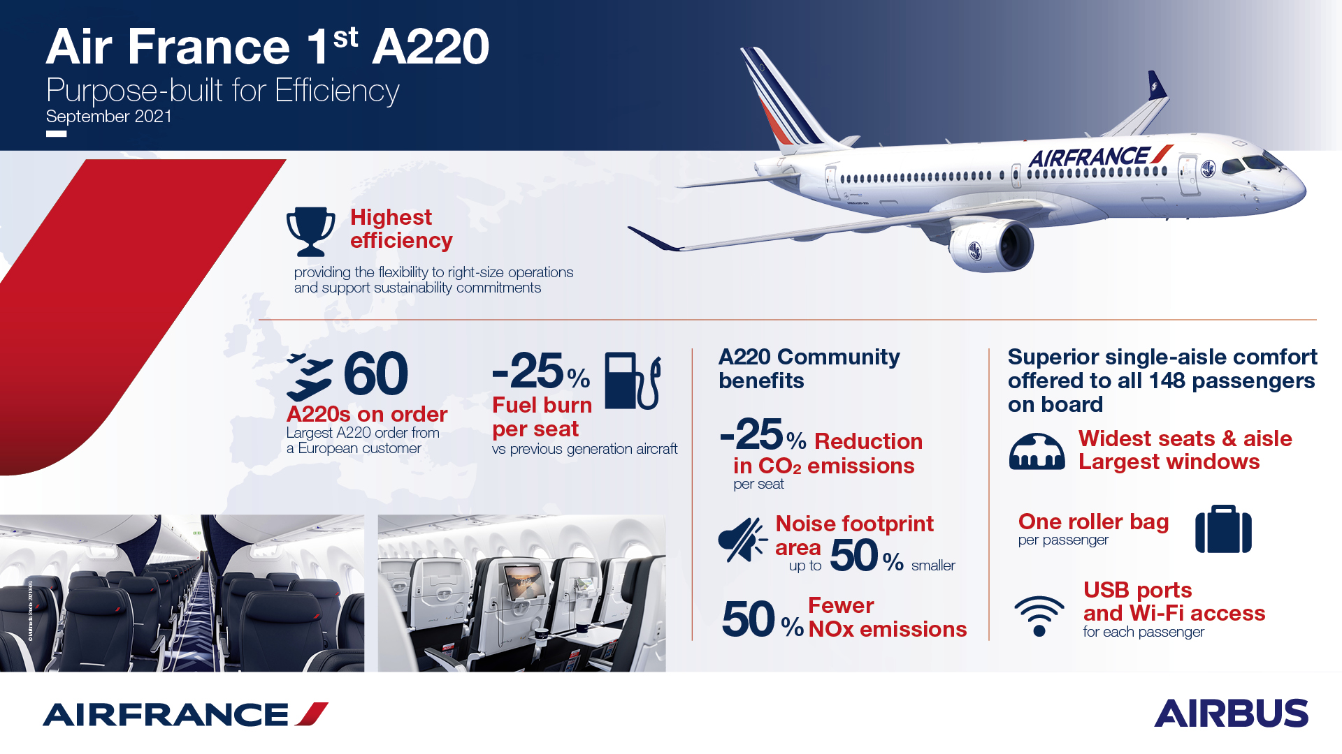 The A220 is the most efficient and flexible aircraft in the 100 to 150 seat market segment today. The renewal of the Air France single-aisle fleet with this latest generation aircraft will increase efficiency along with customer comfort and support Air France to meet its environmental goals and sustainability objectives.