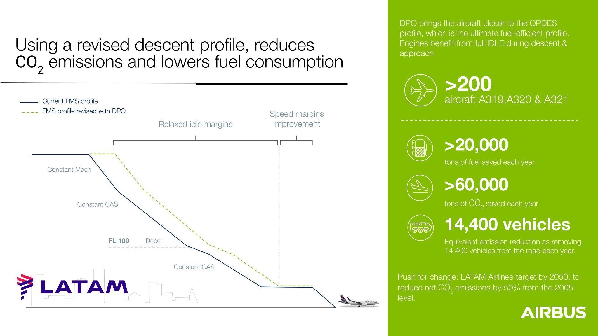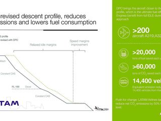 Optimisation of the aircraft’s flight trajectory is one of the key factors to further improve efficiency in cooperation with Air Traffic Control. By optimising the descent trajectories of its aircraft and reducing the fuel flow to the engines -arising from the lowest ‘idle’ thrust setting during the descent phase- thanks to the DPO function, LATAM Airlines will generate over 100 tons fuel savings per year per aircraft across their network, including constrained airports like Lima, Santiago and São Paulo. This will reduce CO2 emissions by over 300 tons per year per aircraft, representing a significant contribution to more sustainable flight operations with 60,000 tons of CO2 each year for the entire LATAM Airlines’ A320 Family fleet.