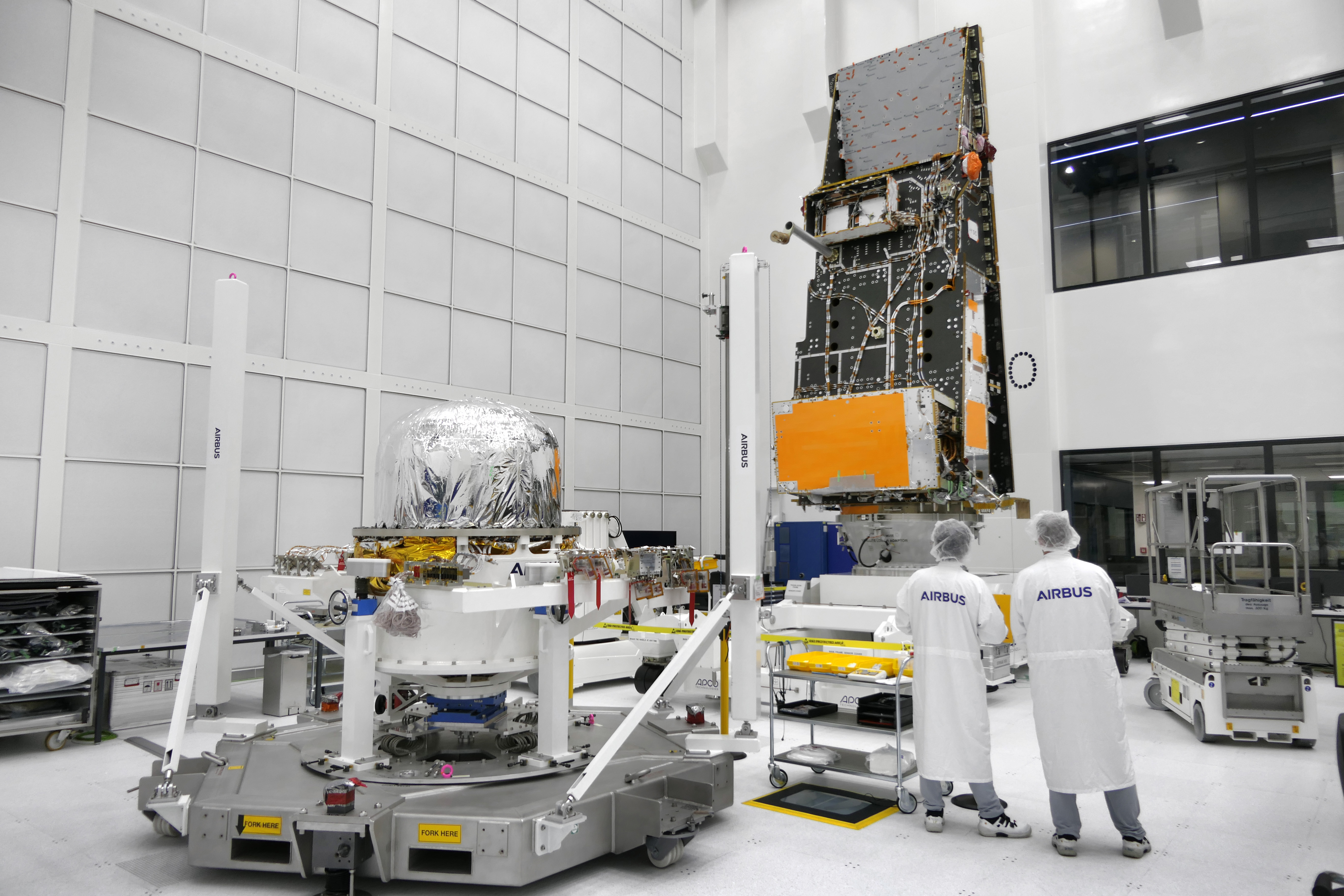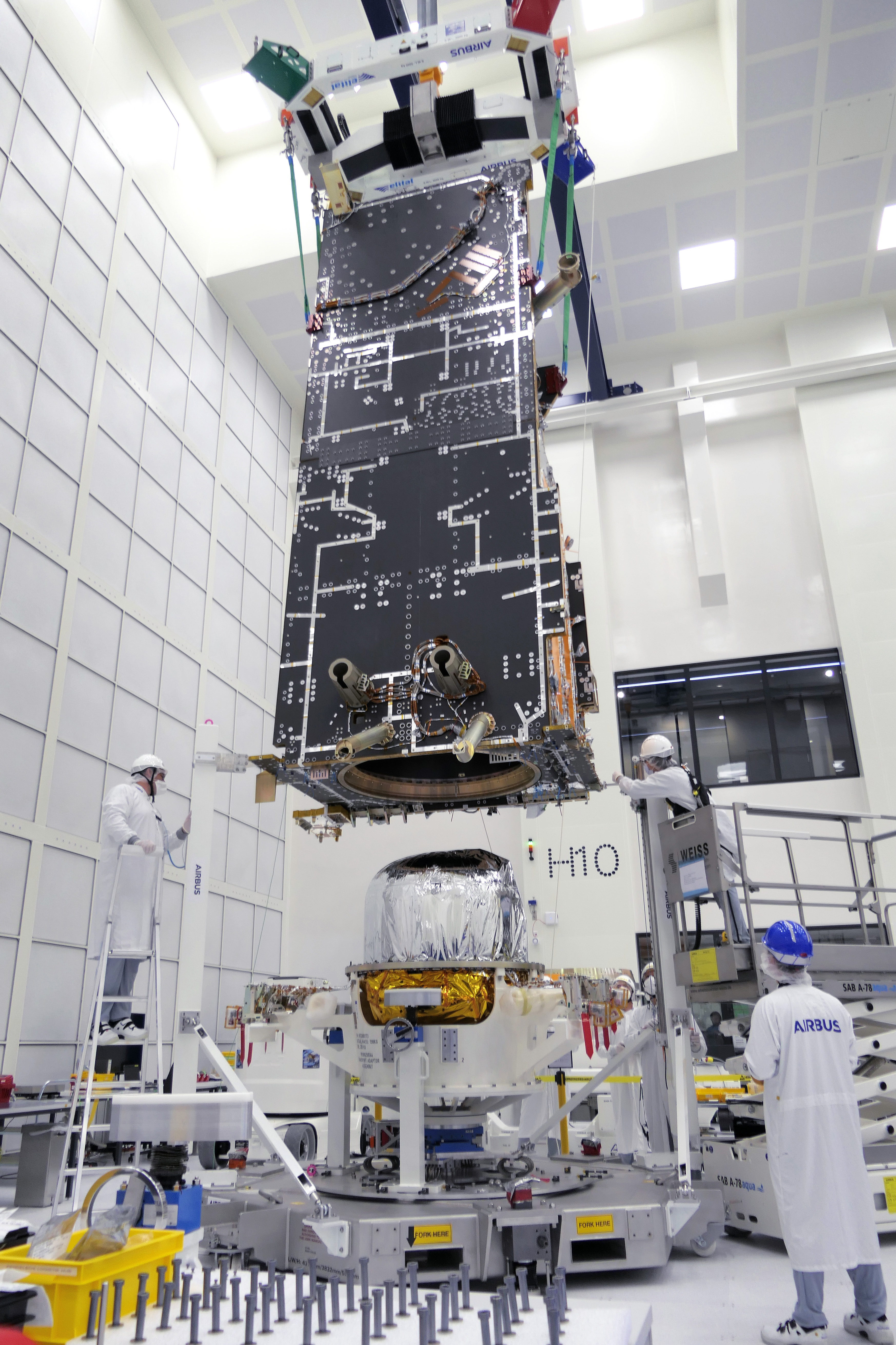 Friedrichshafen, 07 October 2021 – The first "B" model of the next generation polar orbiting weather satellite series MetOp-SG has received its rocket pack. In a tricky, millimetre-precise crane operation at Airbus’ satellite integration centre in Friedrichshafen (Germany), the six metre high satellite structure was integrated with its propulsion system.