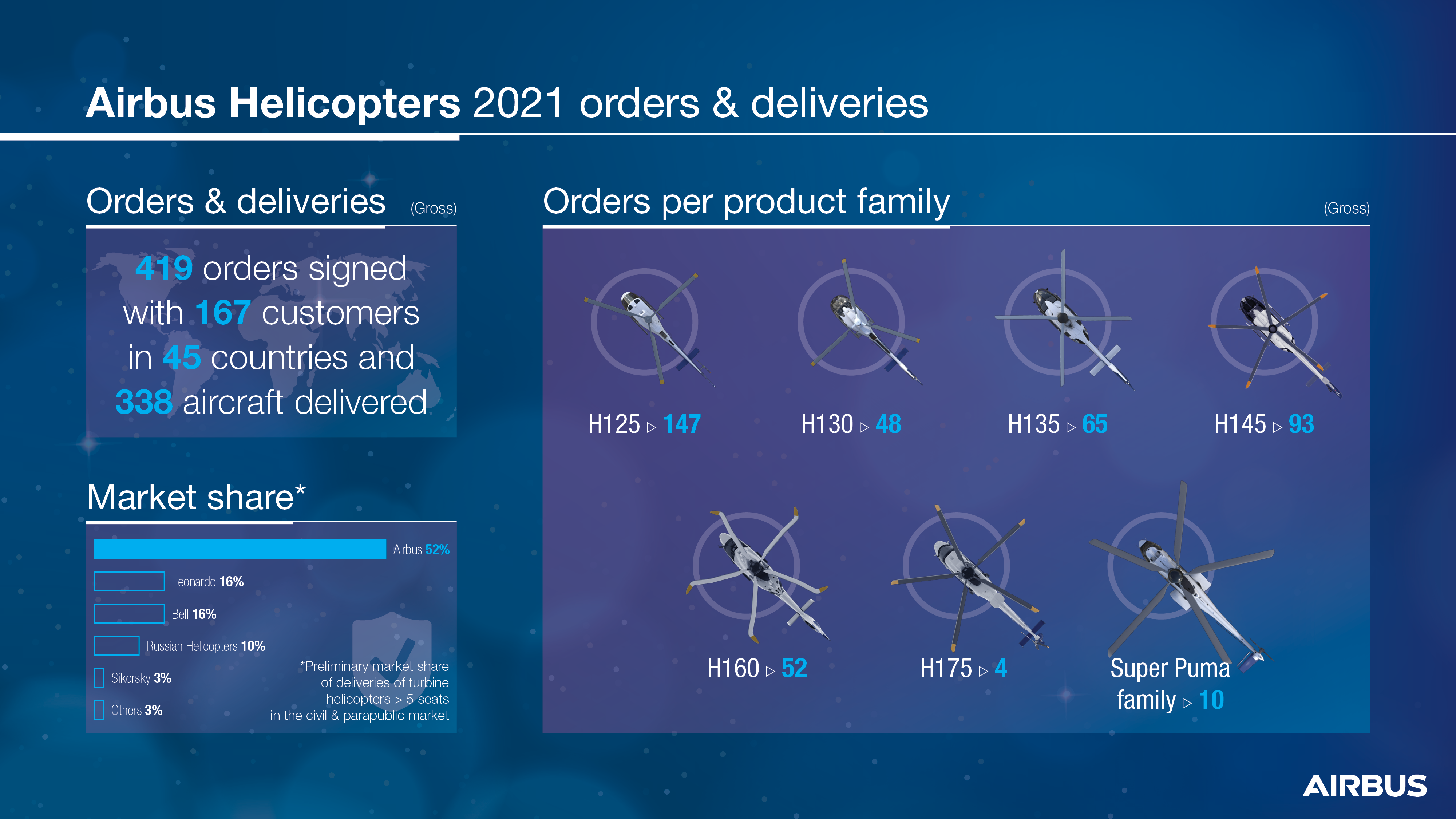 Marignane, 26 January 2022 – In 2021, Airbus Helicopters logged 419 gross orders (net: 414) showing solid signs of recovery from the 2020 market situation which was heavily impacted by the economic consequences of the COVID-19 pandemic. (2020 – 289 gross/ 268 net orders). The increase in orders for light helicopters, H125 and H130, reflects the recovery of the civil and parapublic market. The Company saw strong momentum from its home countries, with France ordering 40 H160s (civil and military versions), eight H225Ms, and two H145s, Spain ordering 36 H135s, and Germany procuring eight H145s for the Bavarian police force. Deliveries increased from 300 in 2020 to 338 in 2021, contributing to Airbus Helicopters’ preliminary 52 % share of the civil and parapublic market and confirming its position as market leader. In number of aircraft units, Airbus Helicopters recorded a net book to bill ratio above one.