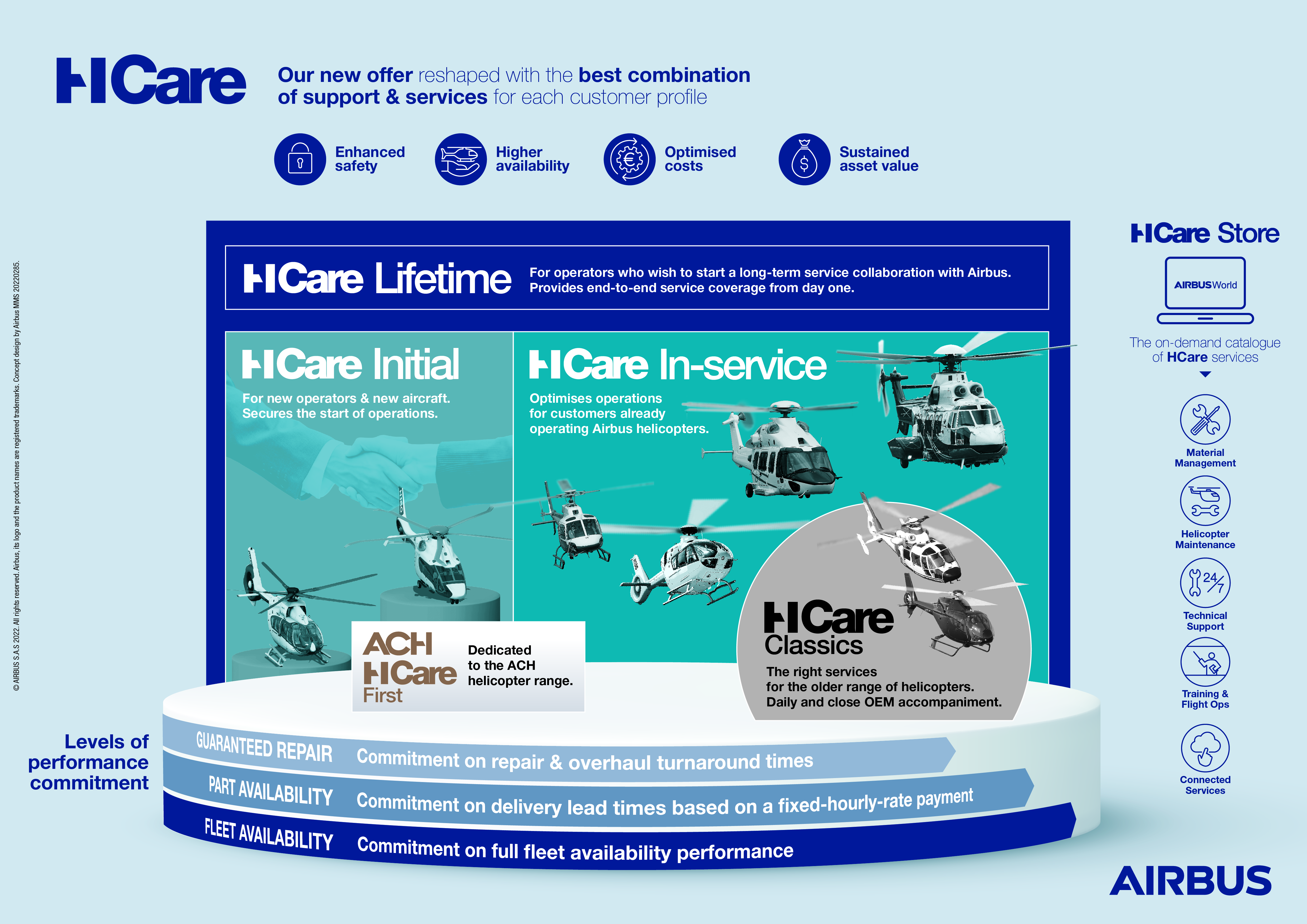 HCare Initial is tailored for customers starting operations with a new Airbus helicopter or taking delivery of a new aircraft type in their fleet. It provides the best set of services for a successful entry into service. HCare In-service is for customers already operating an Airbus helicopter type. Matching services to operators’ needs, it optimises the aircraft’s maintenance, health and usage, and longevity. HCare Lifetime is for operators opting for an end-to-end package and long-term collaboration with Airbus, from entry into service up to the aircraft’s end of life. This global support contract aims to maximise the aircraft’s performance and sustained value over time, while enhancing safety and providing successive, sustained support. Customers receive daily care and accompaniment at all steps of their operations.