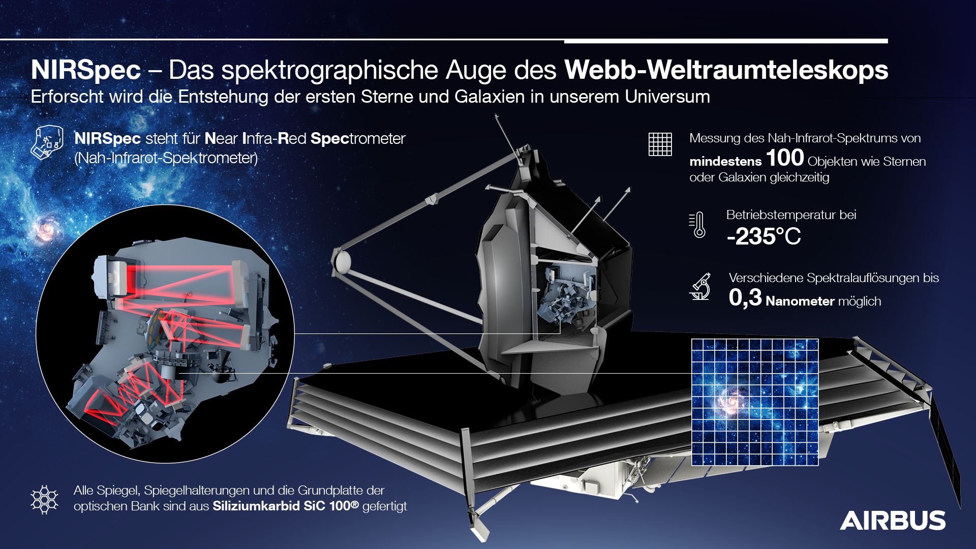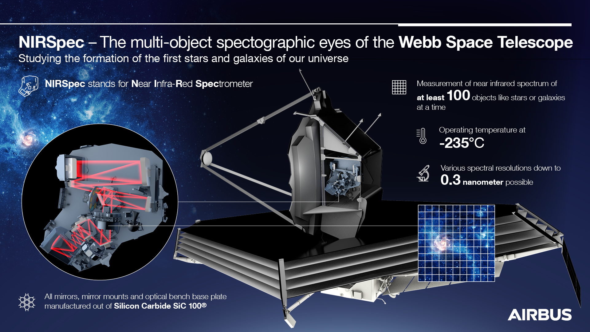 "The Webb telescope will be a turning point in the way we see our Universe," said Jean Marc Nasr, Head of Airbus Space Systems. “Our contributions to the NIRSpec and MIRI instruments represent the pinnacle of technology in modern astronomy. At Airbus, we will bring our unrivaled experience and will be a key partner in the future discoveries of the Webb mission.”