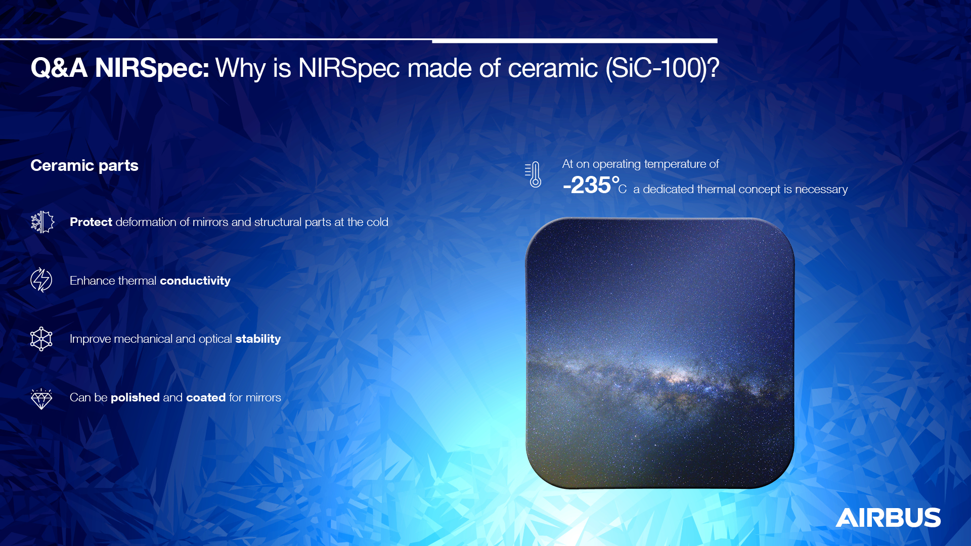 Together with NIRSpec and MIRI (Mid-InfraRed Instrument, also with Airbus involvement), Webb will observe infrared light from space in unprecedented detail, enabling it to look back in time for 13.5 billion years to see the first galaxies formed after the Big Bang or the formation of planetary systems in our own galaxy, the Milky Way. Webb is a true time machine that will push the frontiers of our knowledge, exploring the Universe like never before.