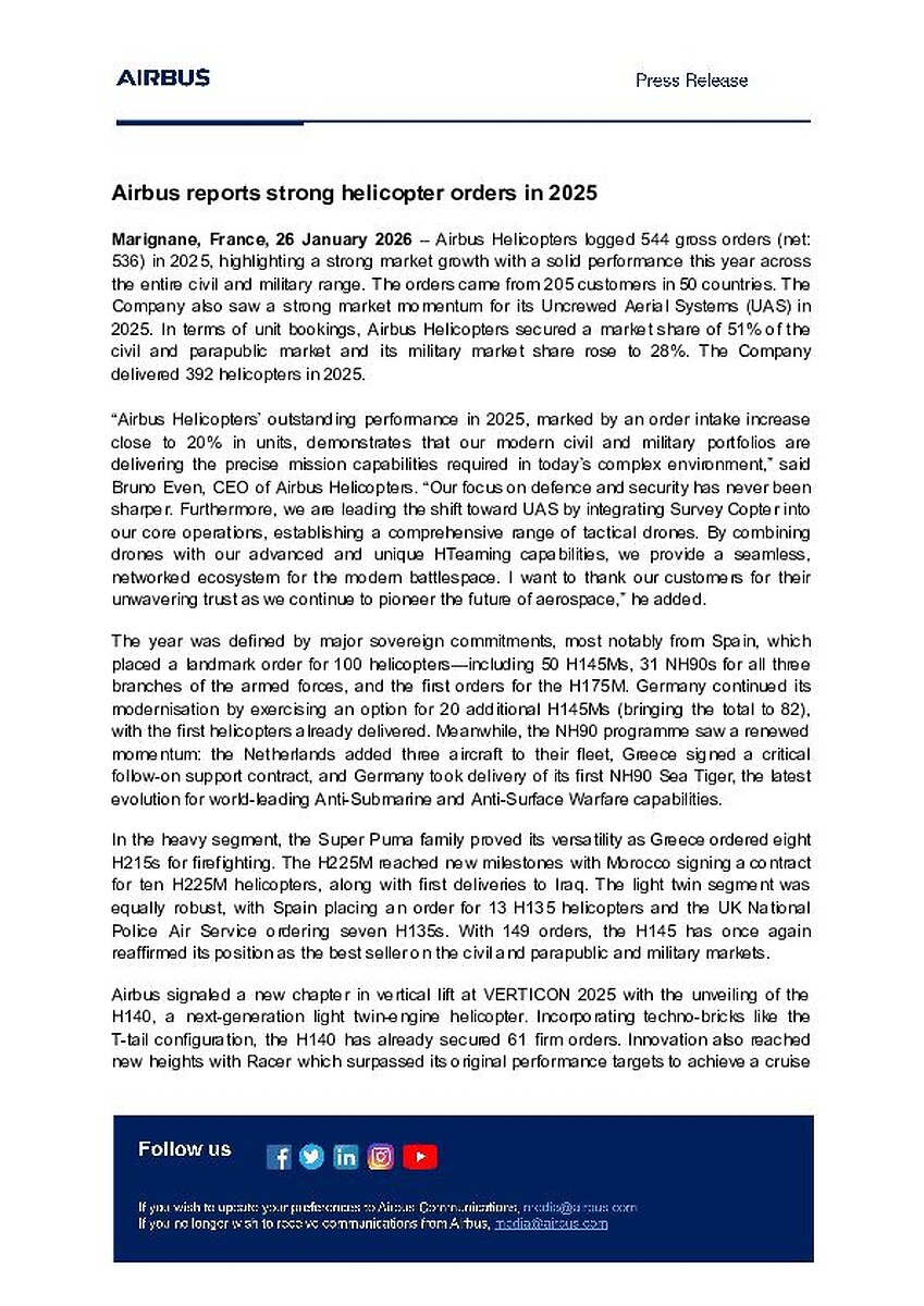 Marignane, France, 26 January 2026 – Airbus Helicopters logged 544 gross orders (net: 536) in 2025, highlighting a strong market growth with a solid performance this year across the entire civil and military range. The orders came from 205 customers in 50 countries. The Company also saw a strong market momentum for its Uncrewed Aerial Systems (UAS) in 2025. In terms of unit bookings, Airbus Helicopters secured a market share of 51% of the civil and parapublic market and its military market share rose to 28%. The Company delivered 392 helicopters in 2025.
