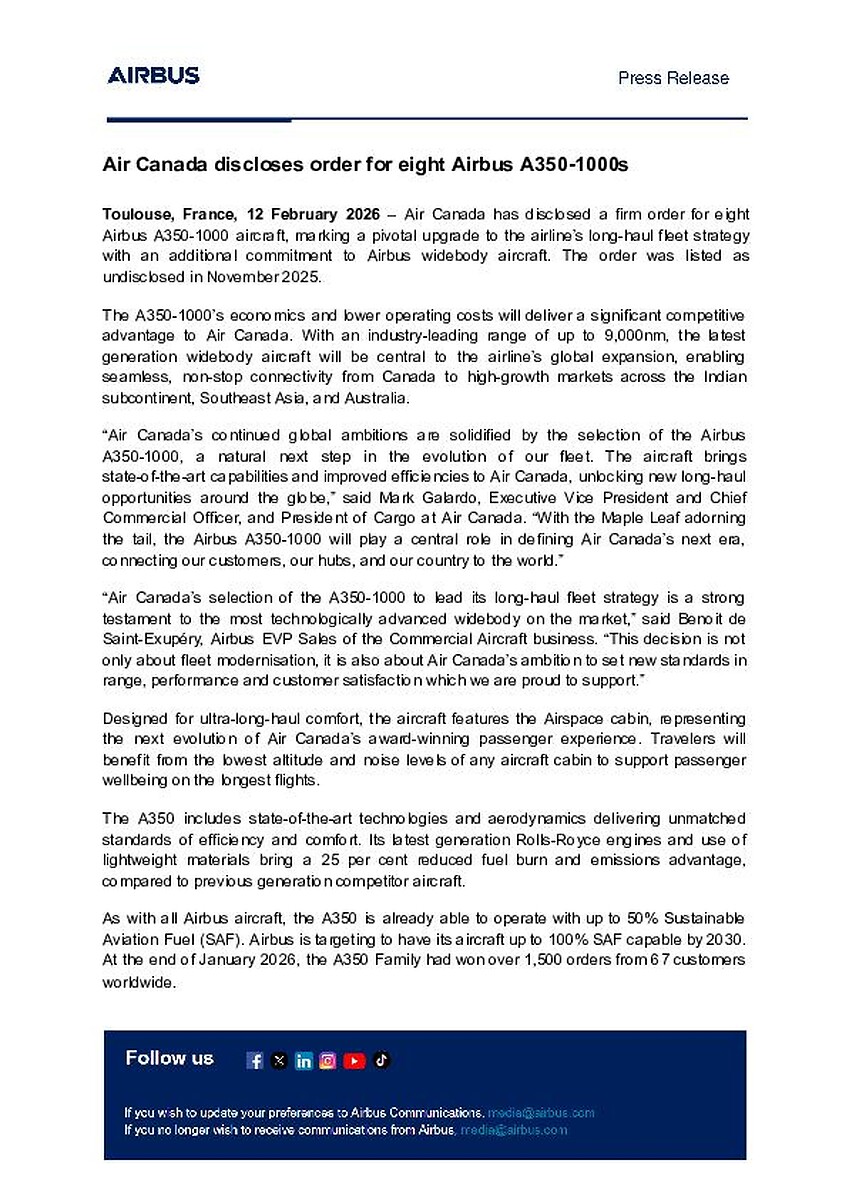 Toulouse, France, 12 February 2026 – Air Canada has disclosed a firm order for eight Airbus A350-1000 aircraft, marking a pivotal upgrade to the airline’s long-haul fleet strategy with an additional commitment to Airbus widebody aircraft. The order was listed as undisclosed in November 2025.