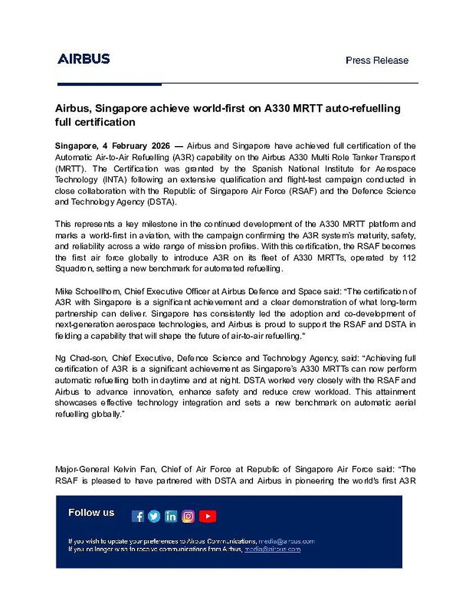 Singapore, 4 February 2026 — Airbus and Singapore have achieved full certification of the Automatic Air-to-Air Refuelling (A3R) capability on the Airbus A330 Multi Role Tanker Transport (MRTT). The Certification was granted by the Spanish National Institute for Aerospace Technology (INTA) following an extensive qualification and flight-test campaign conducted in close collaboration with the Republic of Singapore Air Force (RSAF) and the Defence Science and Technology Agency (DSTA).