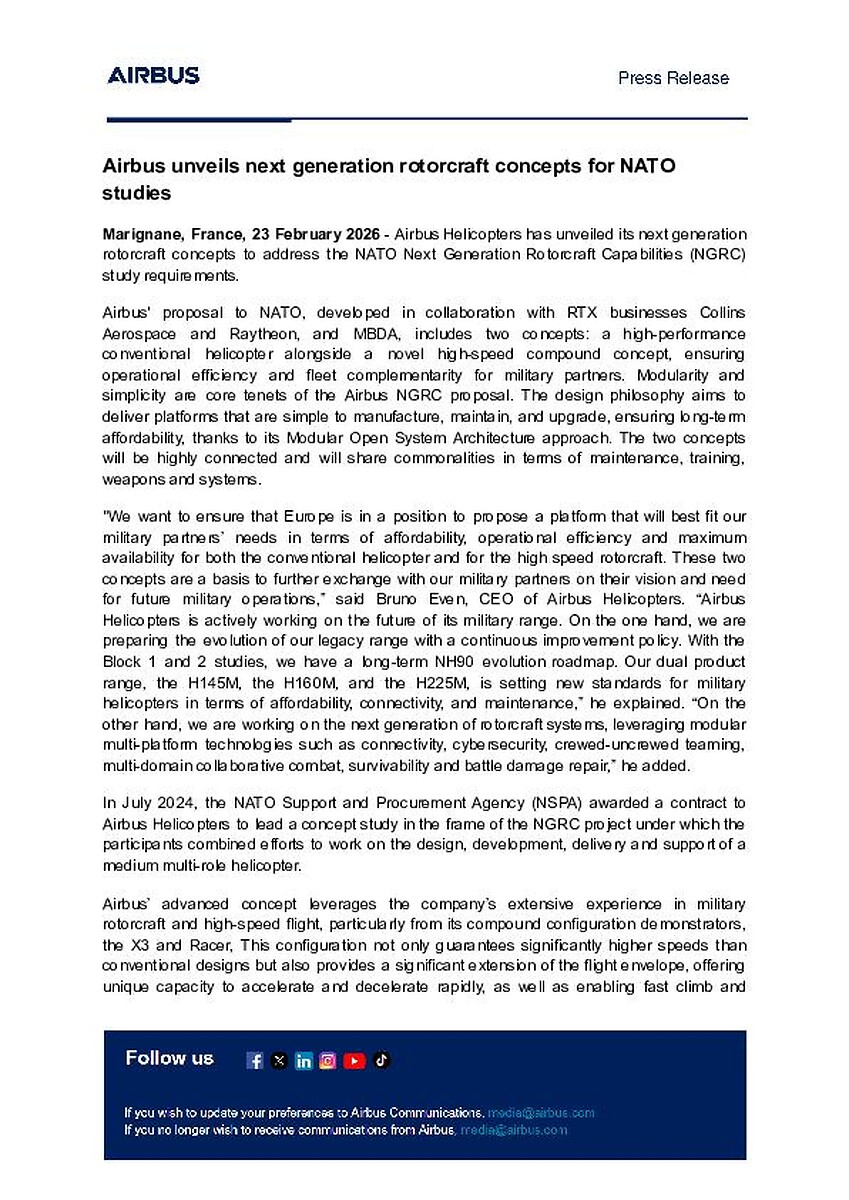 Marignane, France, 23 February 2026 - Airbus Helicopters has unveiled its next generation rotorcraft concepts to address the NATO Next Generation Rotorcraft Capabilities (NGRC) study requirements.