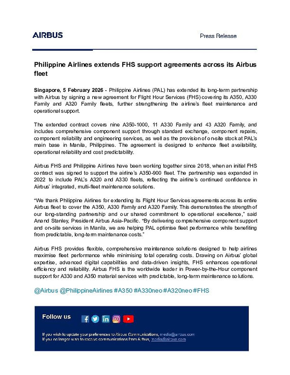 Singapore, 5 February 2026 - Philippine Airlines (PAL) has extended its long-term partnership with Airbus by signing a new agreement for Flight Hour Services (FHS) covering its A350, A330 Family and A320 Family fleets, further strengthening the airline’s fleet maintenance and operational support.217001