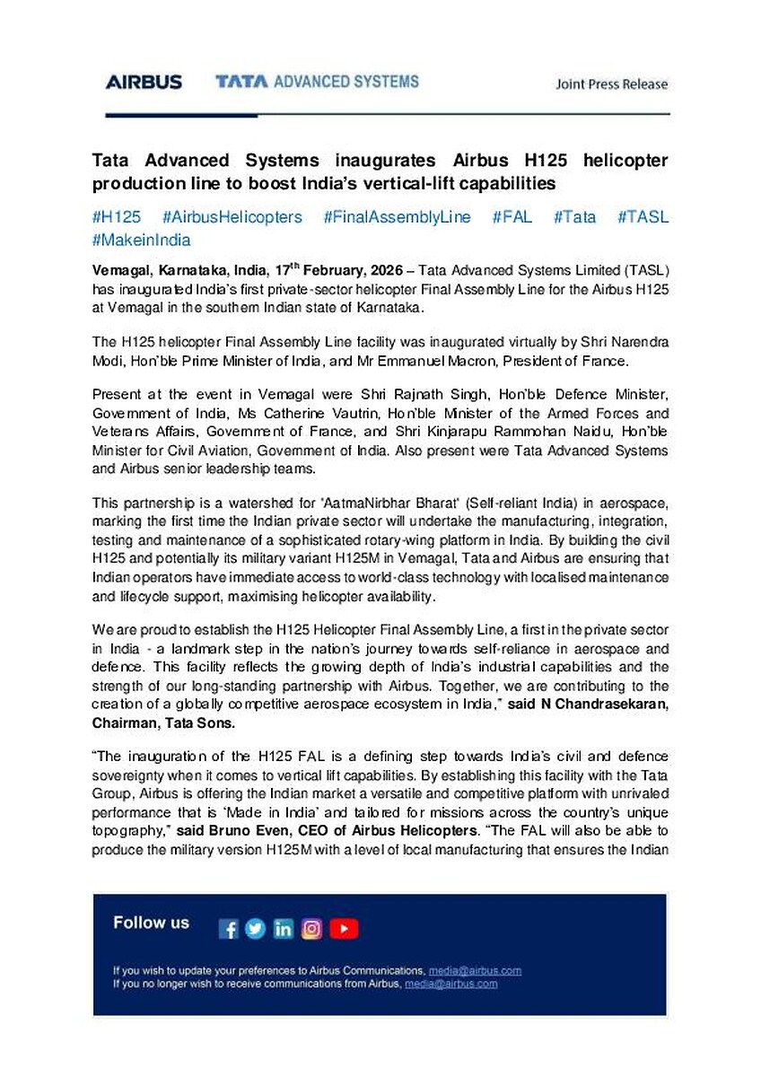 We are proud to establish the H125 Helicopter Final Assembly Line, a first in the private sector in India - a landmark step in the nation’s journey towards self-reliance in aerospace and defence. This facility reflects the growing depth of India’s industrial capabilities and the strength of our long-standing partnership with Airbus. Together, we are contributing to the creation of a globally competitive aerospace ecosystem in India,” said N Chandrasekaran, Chairman, Tata Sons.
