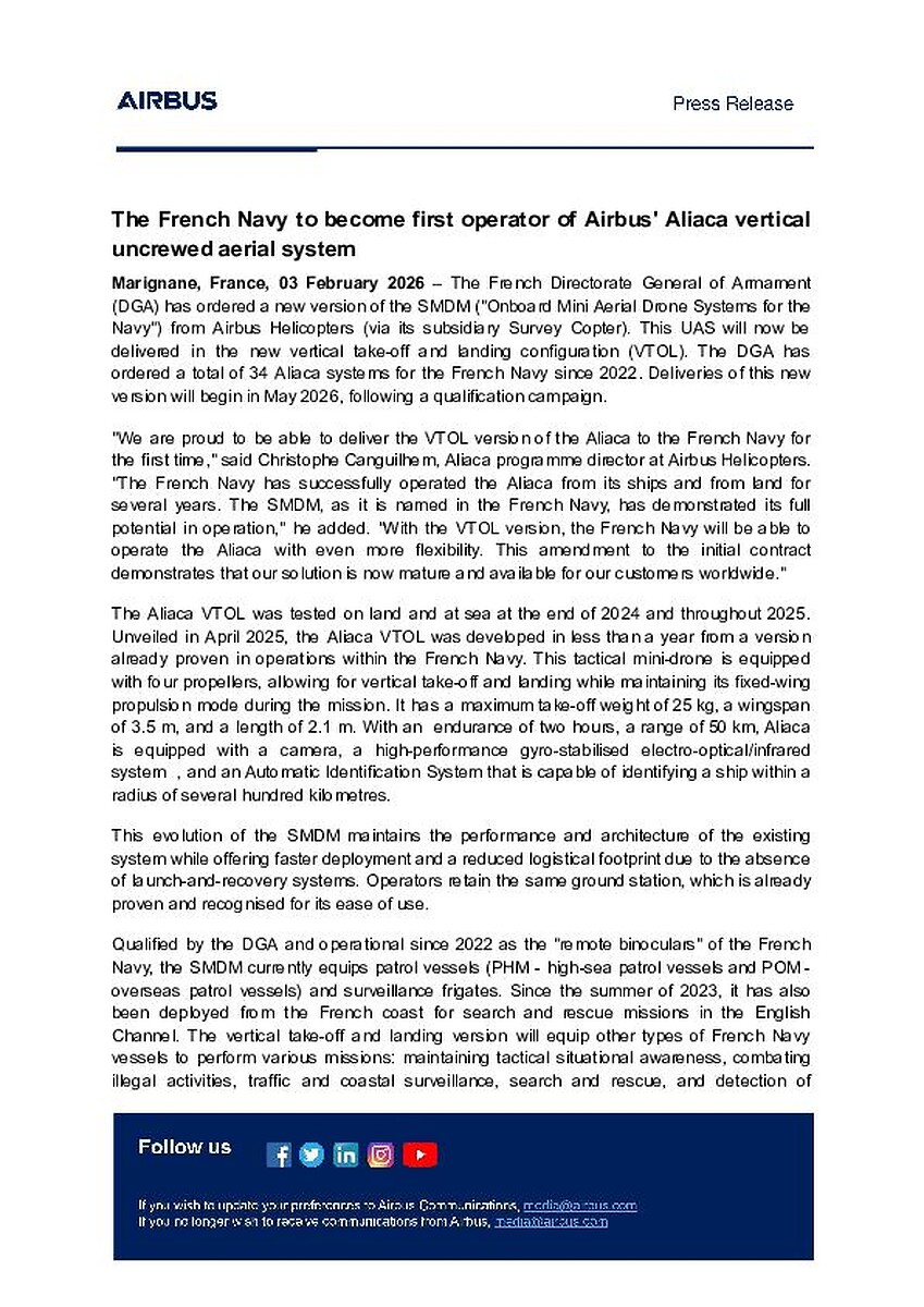 Marignane, France, 03 February 2026 – The French Directorate General of Armament (DGA) has ordered a new version of the SMDM ("Onboard Mini Aerial Drone Systems for the Navy") from Airbus Helicopters (via its subsidiary Survey Copter). This UAS will now be delivered in the new vertical take-off and landing configuration (VTOL). The DGA has ordered a total of 34 Aliaca systems for the French Navy since 2022. Deliveries of this new version will begin in May 2026, following a qualification campaign.