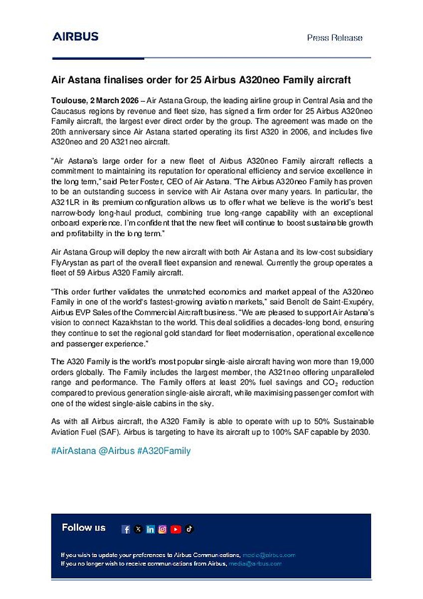 Toulouse, 2 March 2026 – Air Astana Group, the leading airline group in Central Asia and the Caucasus regions by revenue and fleet size, has signed a firm order for 25 Airbus A320neo Family aircraft, the largest ever direct order by the group. The agreement was made on the 20th anniversary since Air Astana started operating its first A320 in 2006, and includes five A320neo and 20 A321neo aircraft.
